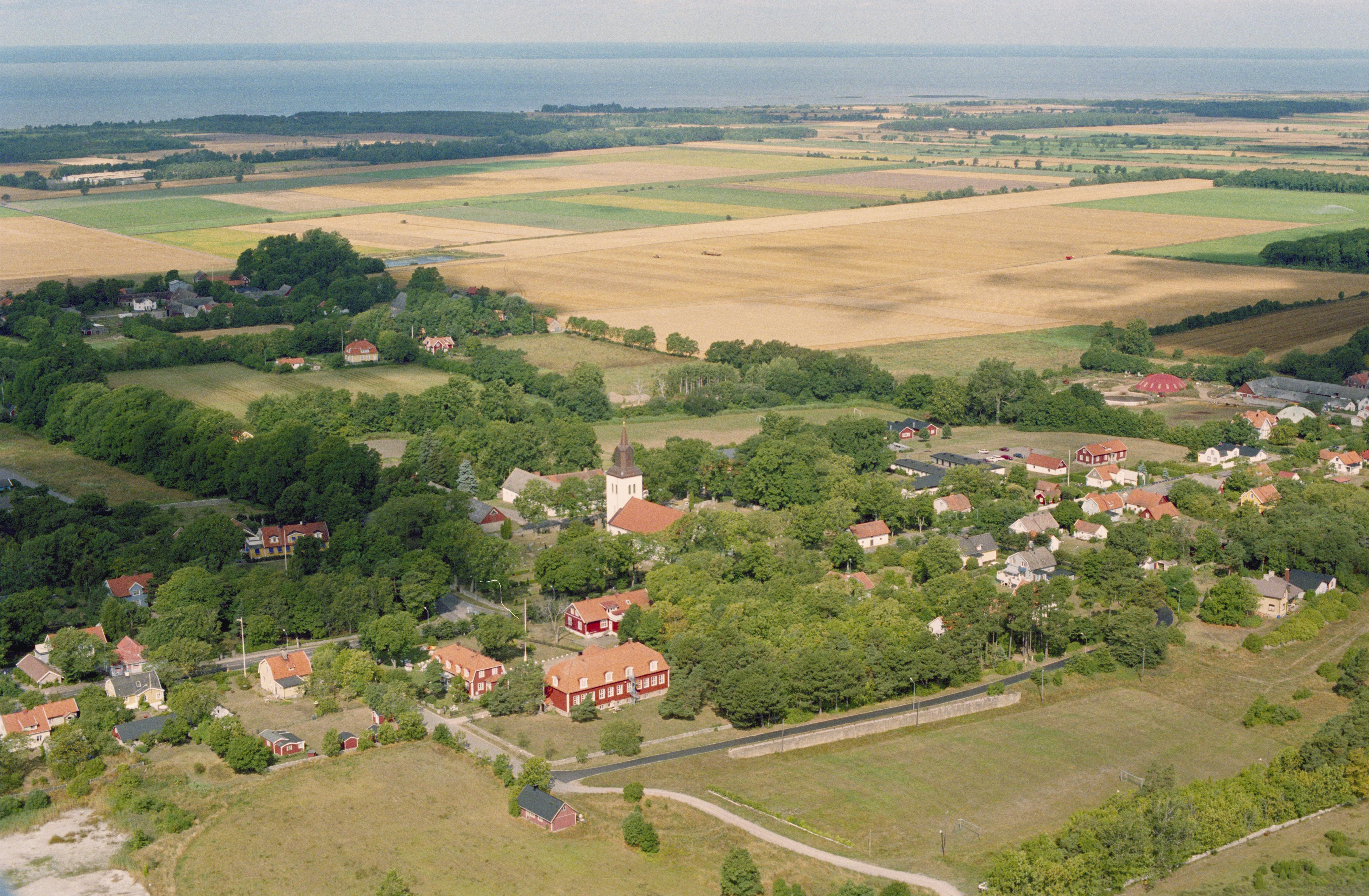 Beskrivning: Alvaret. Kastlösa kyrka och kyrkby. Bilden är tagen mot (väderstreck): NV