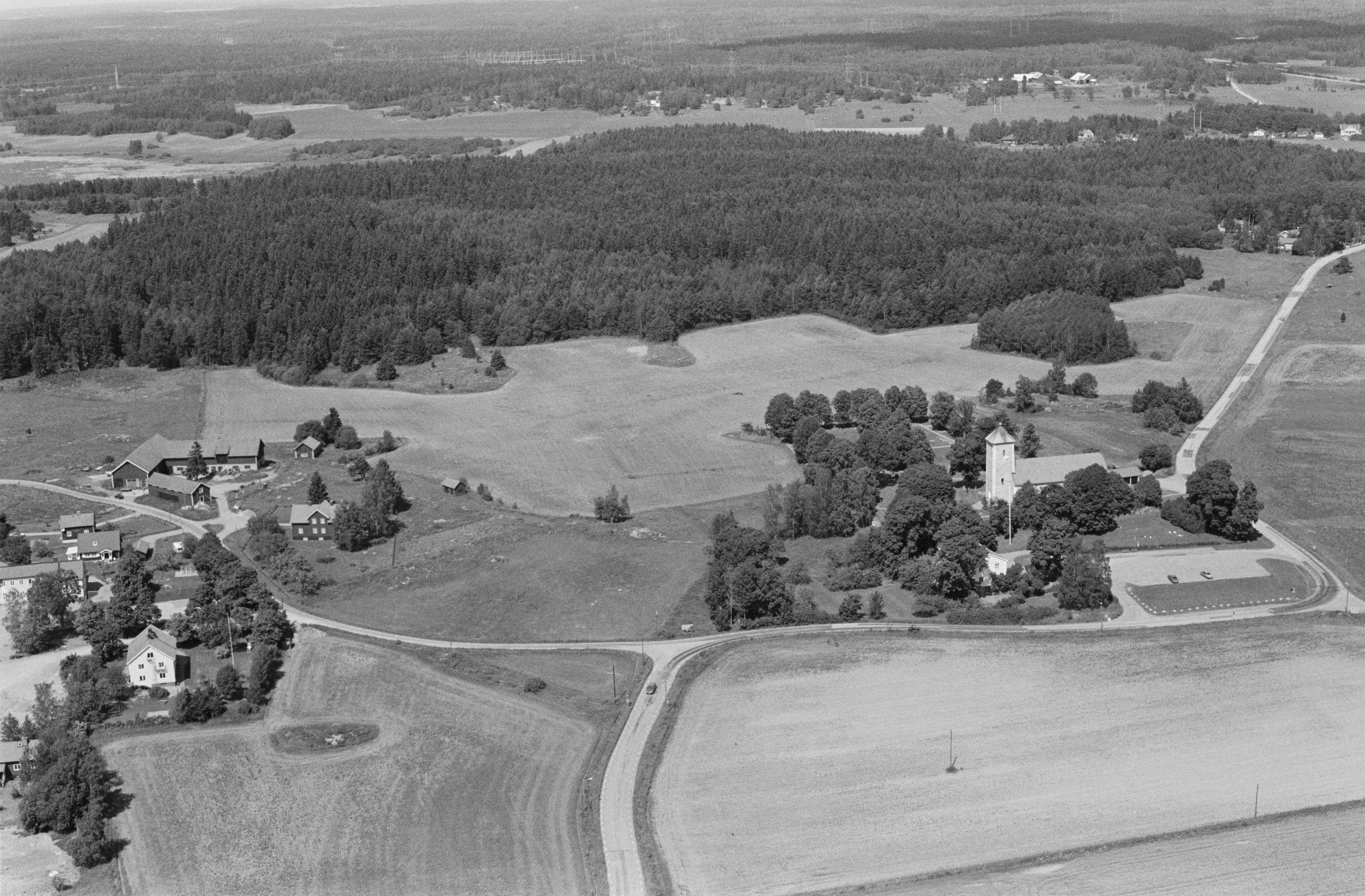 Beskrivning: Odensala kyrka. I bildens övre del Rickebyåns dalgång och gränsen mot Knivsta socken. Bilden är tagen mot (väderstreck): N