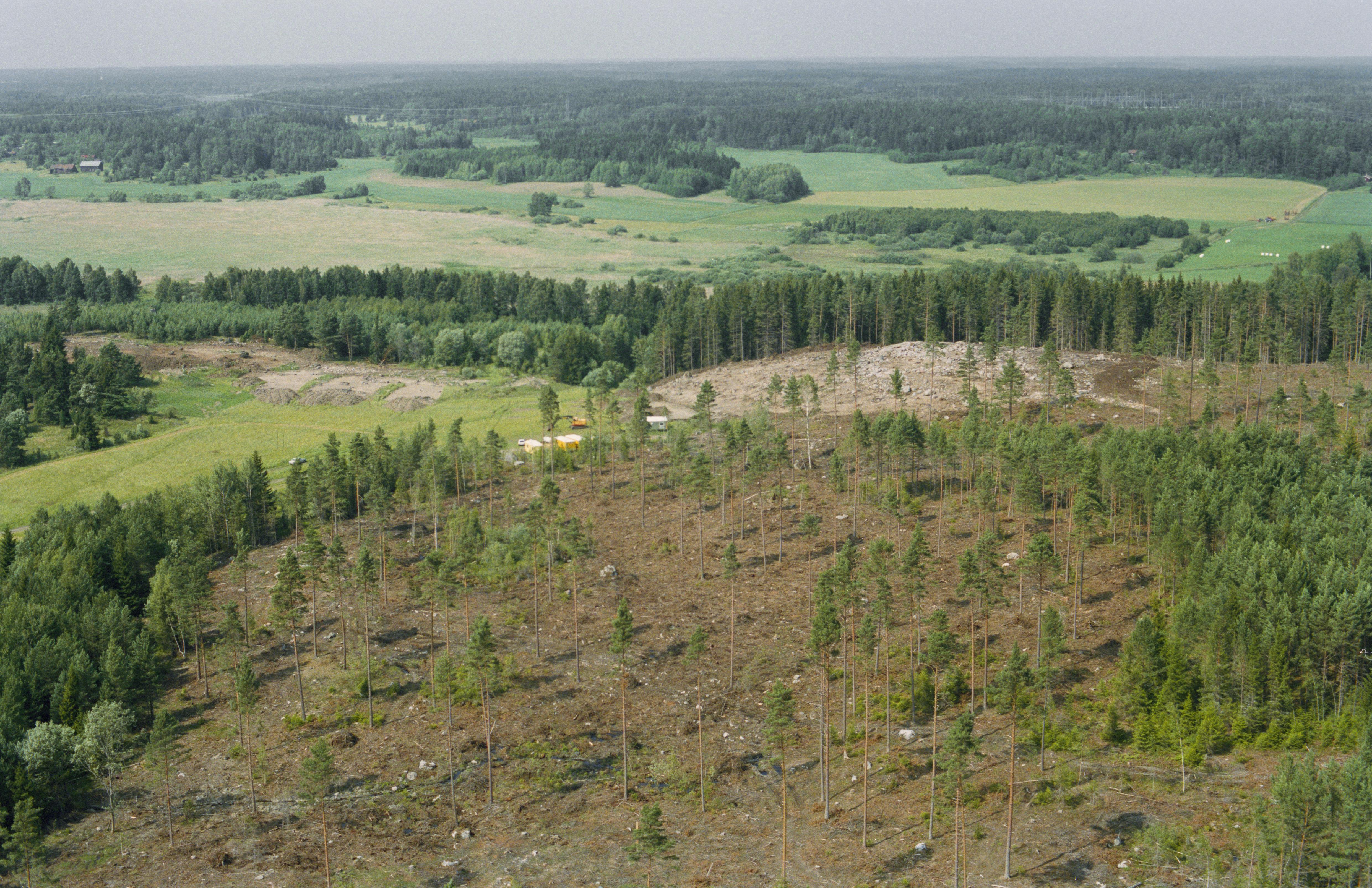 Beskrivning: Arkeologisk undersökning innan bygge av järnväg (Arlandabanan) i Rickebyåns dalgång i områden söder om Svartsjön. Vid bildens mitt bytomt RAÄnr Odensala 288:1 till vänster och fornborg Odensala 235:1 till höger boplats Odensala 489:1, m.fl. Bilden är tagen mot (väderstreck): NV