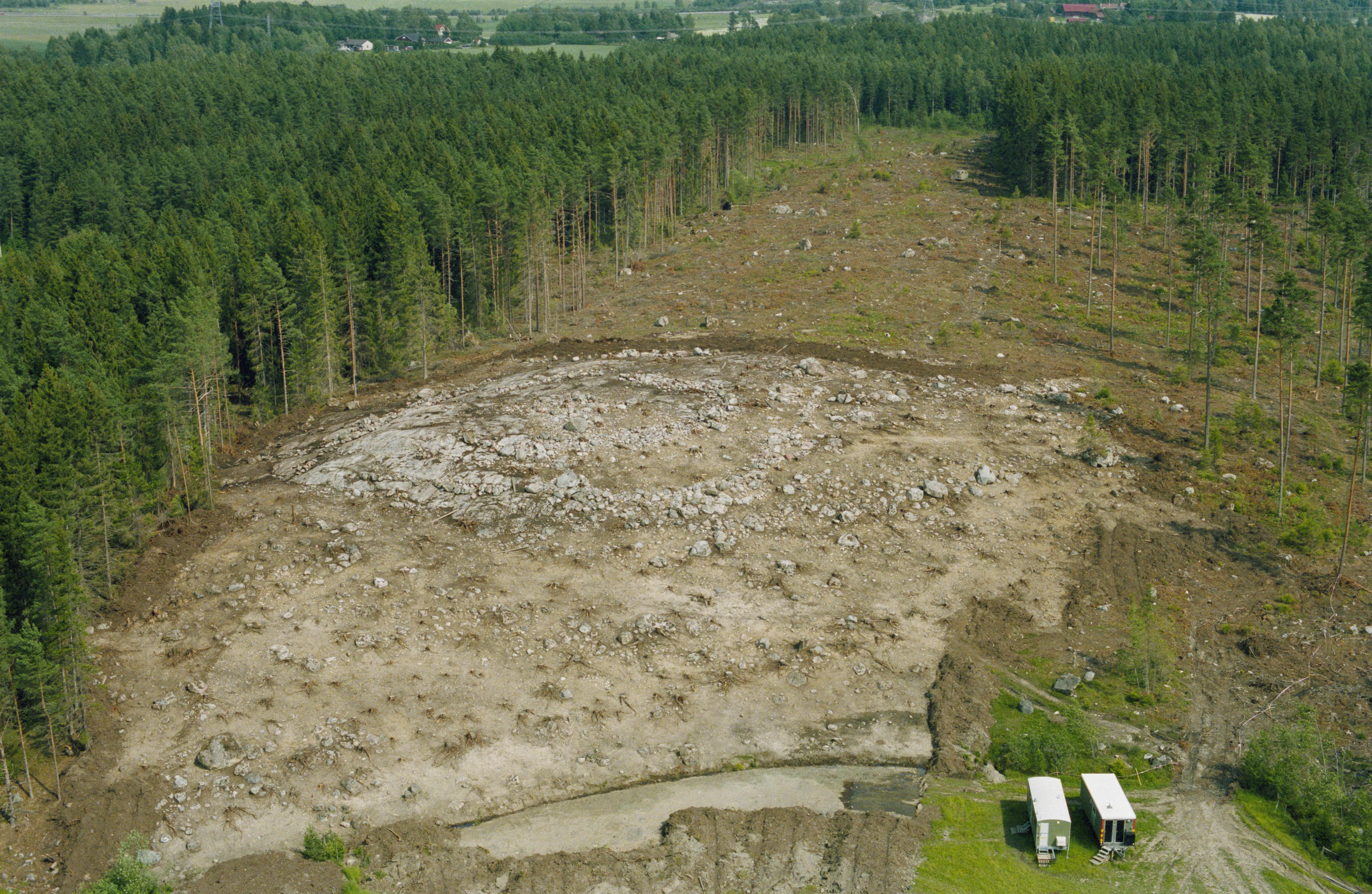 Beskrivning: Arkeologisk undersökning innan bygge av järnväg (Arlandabanan) i Rickebyåns dalgång i områden söder om Svartsjön. Fornborg Odensala 235:1, boplats Odensala 489:1, m.fl. Bilden är tagen mot (väderstreck): OSO