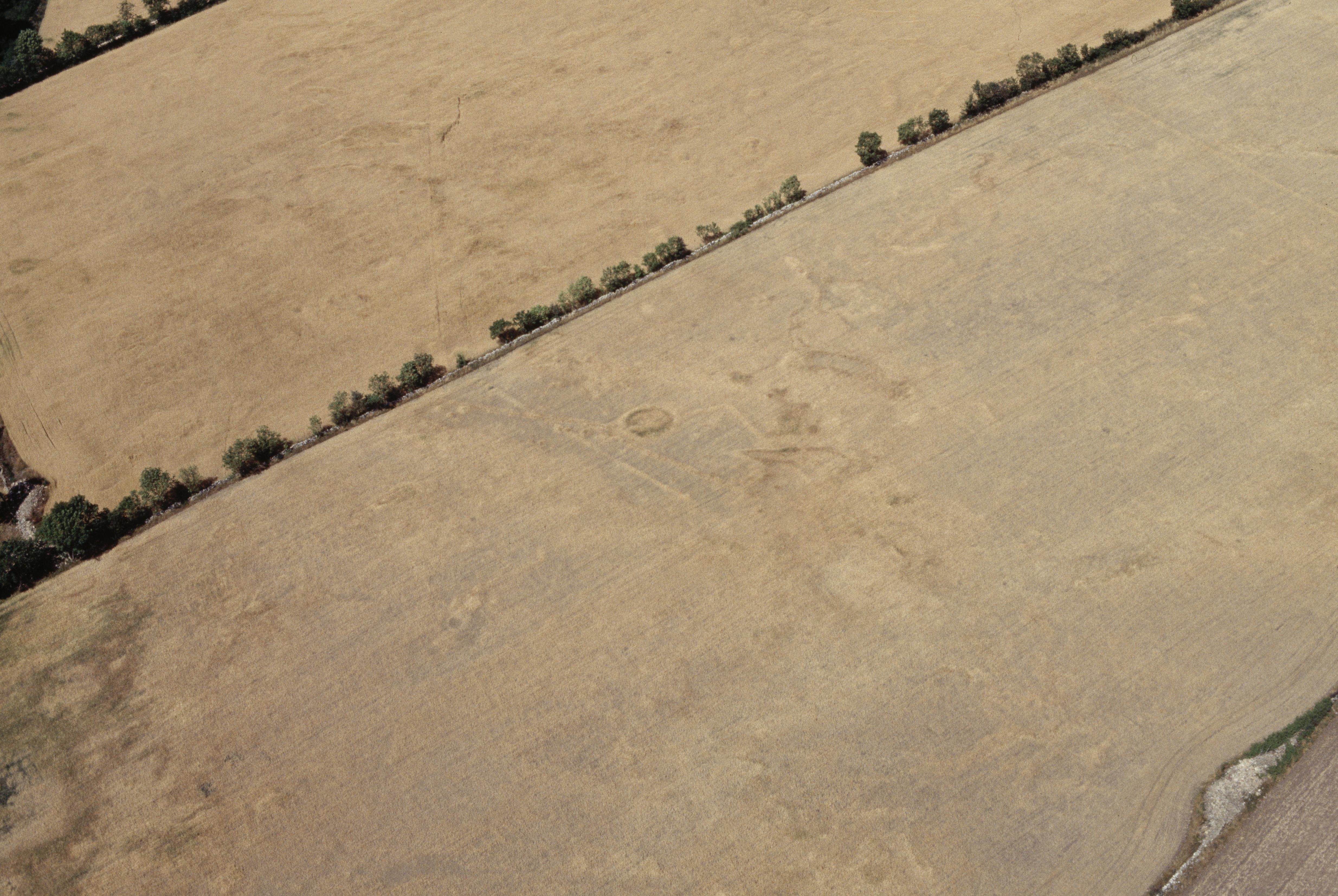 Beskrivning: Cropmarks i åker med fornlämningar, bl.a. boplats RAÄnr Köping 273:1, 274:1, 275:1 och fyndplats Köping 324:1. Bilden är tagen mot (väderstreck): NV