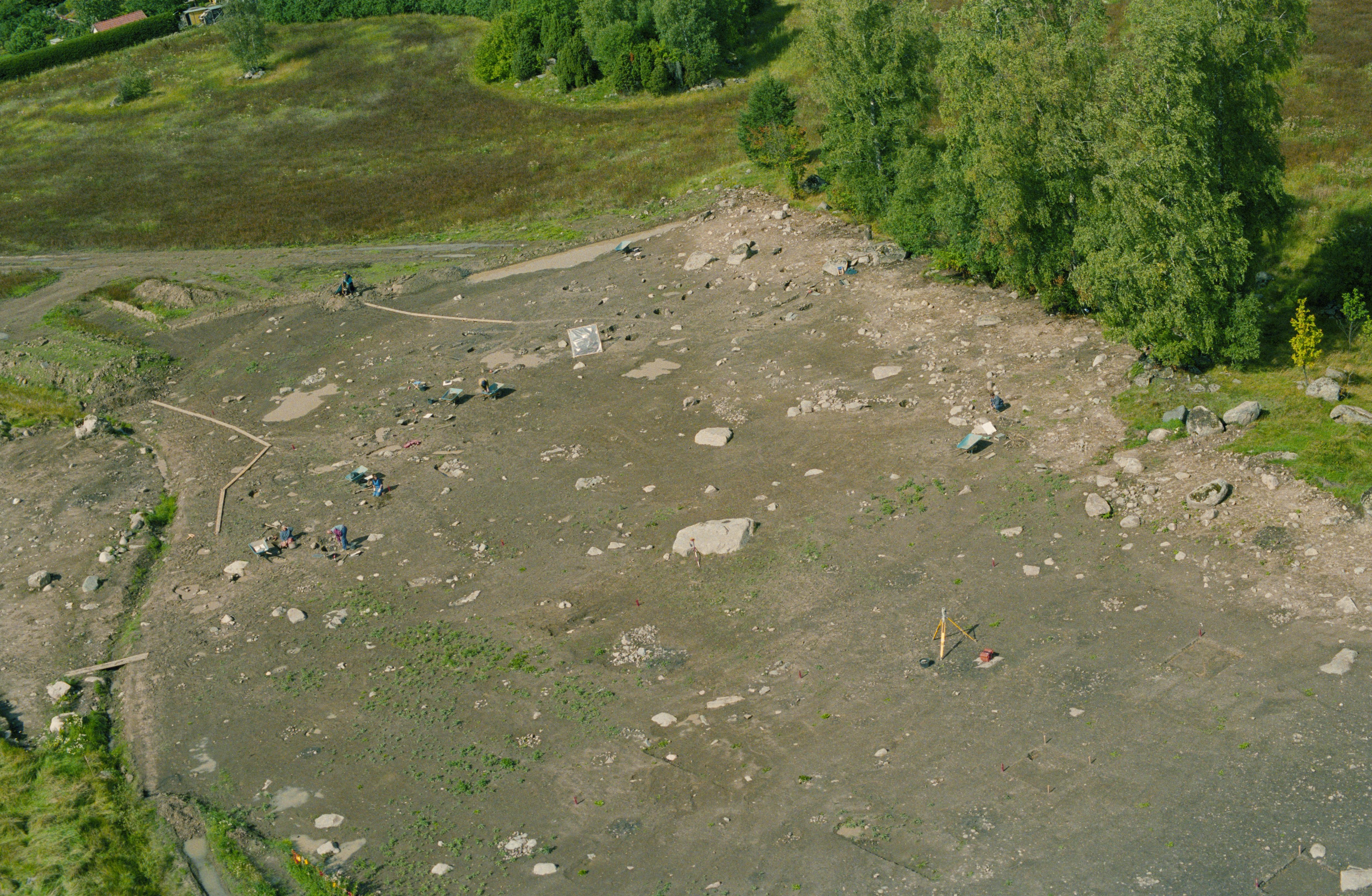 Beskrivning: Arkeologisk undersökning innan bygge av järnväg (Arlandabanan) i Rickebyåns dalgång vid Åslunda by sydost om Svartsjön. Bo- och gravplats Odensala 402:1-2, 11:1 och 13:1. Bilden är tagen mot (väderstreck): NV