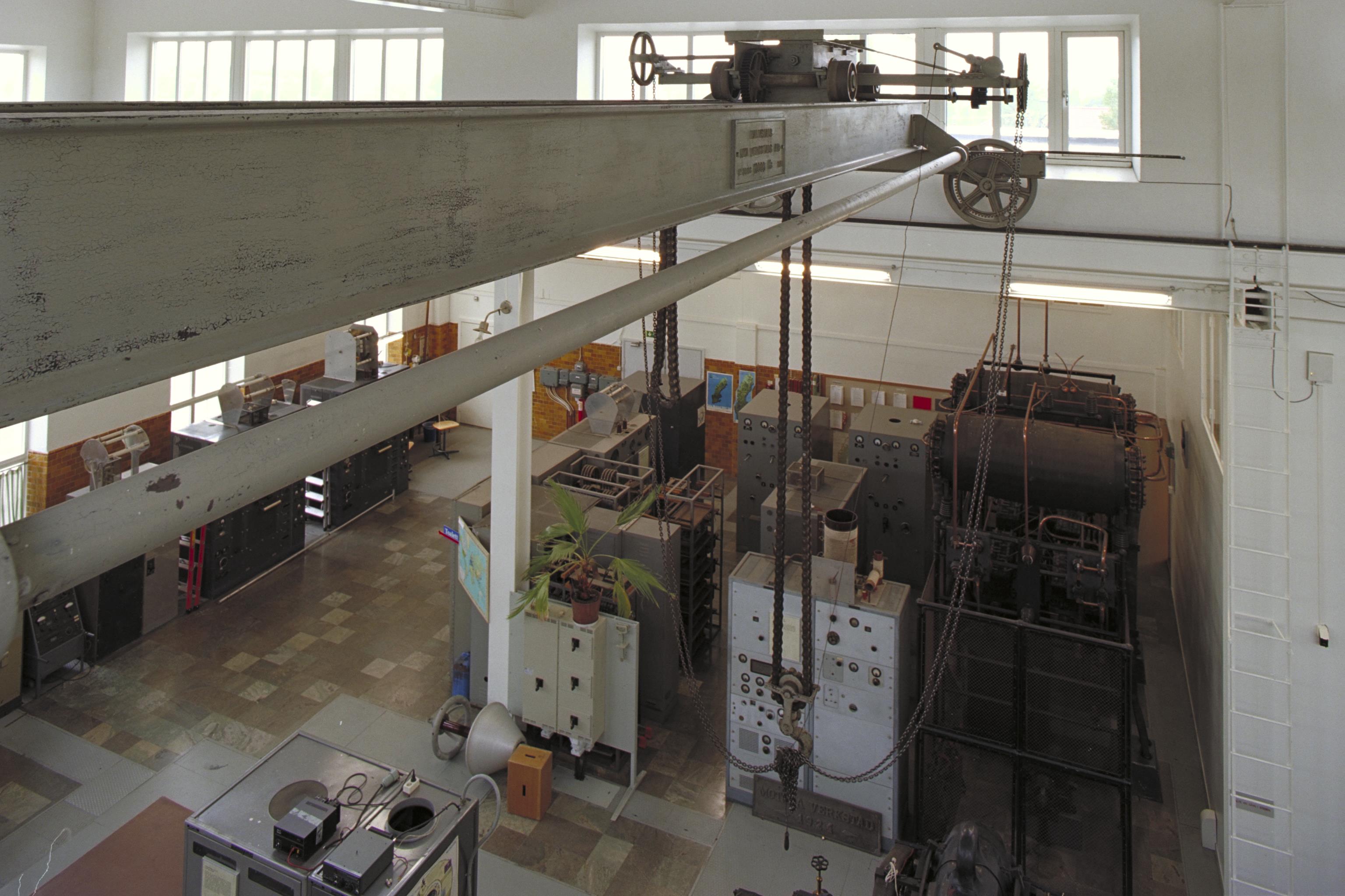 Sändarsalen sedd från ovan med äldre kortvågssändare. Till höger antenntransformator, antennkniv för 200 kW Alexandersonlångvågssändaren.