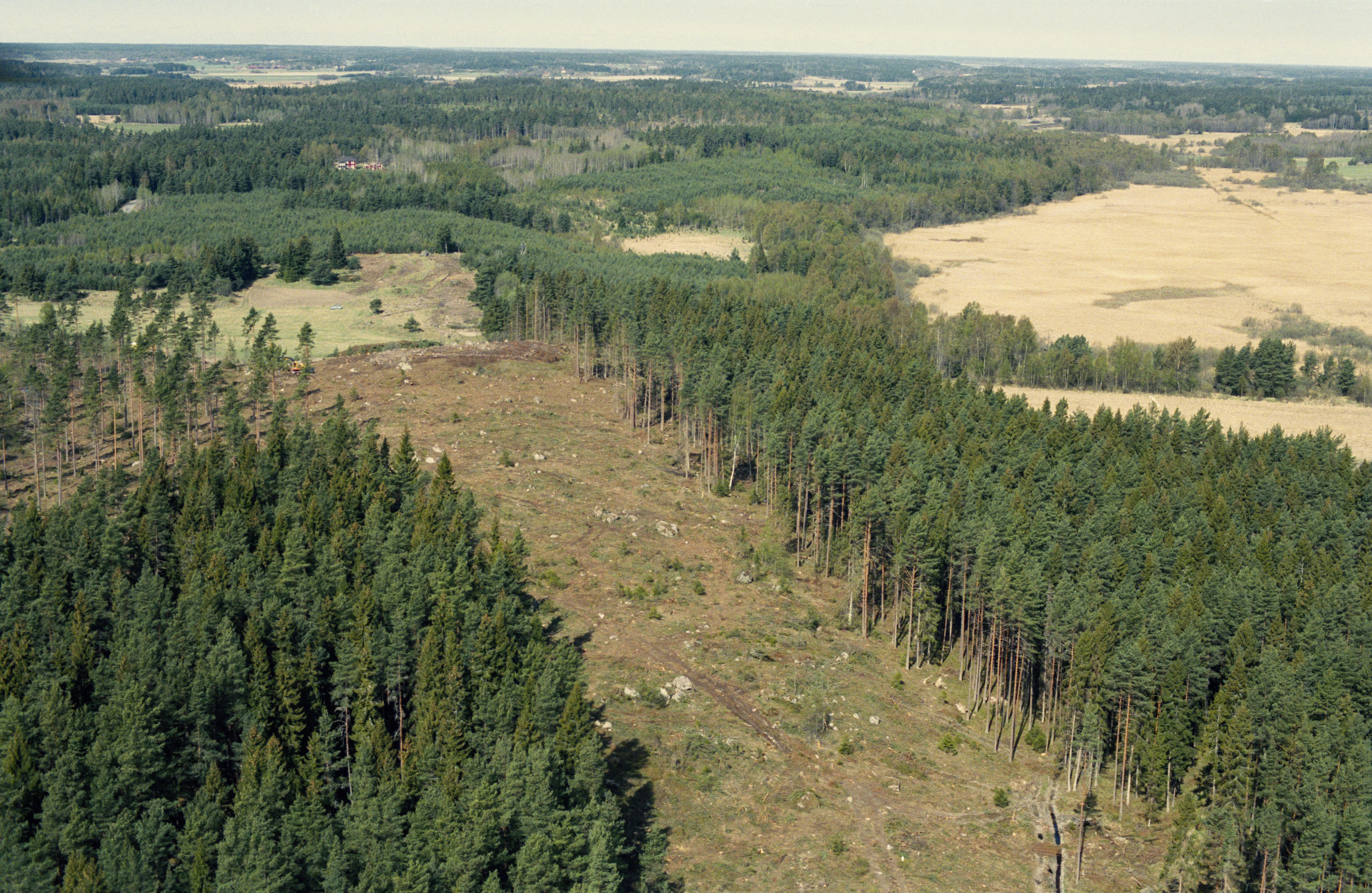 Beskrivning: Arkeologisk undersökning innan bygge av järnväg (Arlandabanan) i Rickebyåns dalgång i områden söder om Svartsjön. I bildens övre del fornborg Odensala 235:1, boplats Odensala 489:1, m.fl. Bilden är tagen mot (väderstreck): VNV