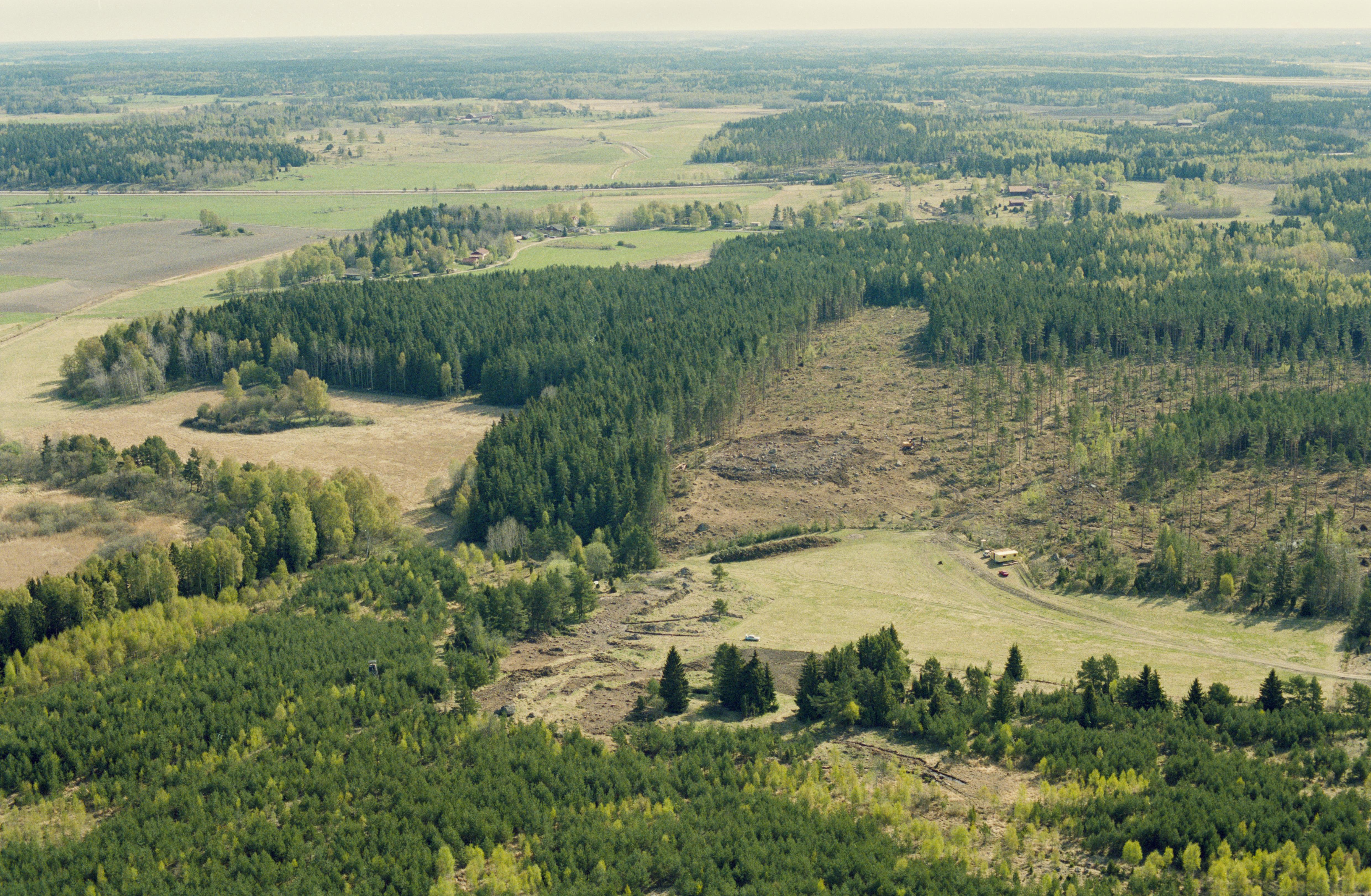 Beskrivning: Arkeologisk undersökning innan bygge av järnväg (Arlandabanan) i Rickebyåns dalgång i områden söder om Svartsjön. Hägnad RAÄnr Odensala 407:1, fornborg Odensala 235:1, bytomt Odensala 288:1, boplats Odensala 489:1, stensättning Odensala 236:1 m.fl. Knivsta socken i bildens övre del. Bilden är tagen mot (väderstreck): OSO