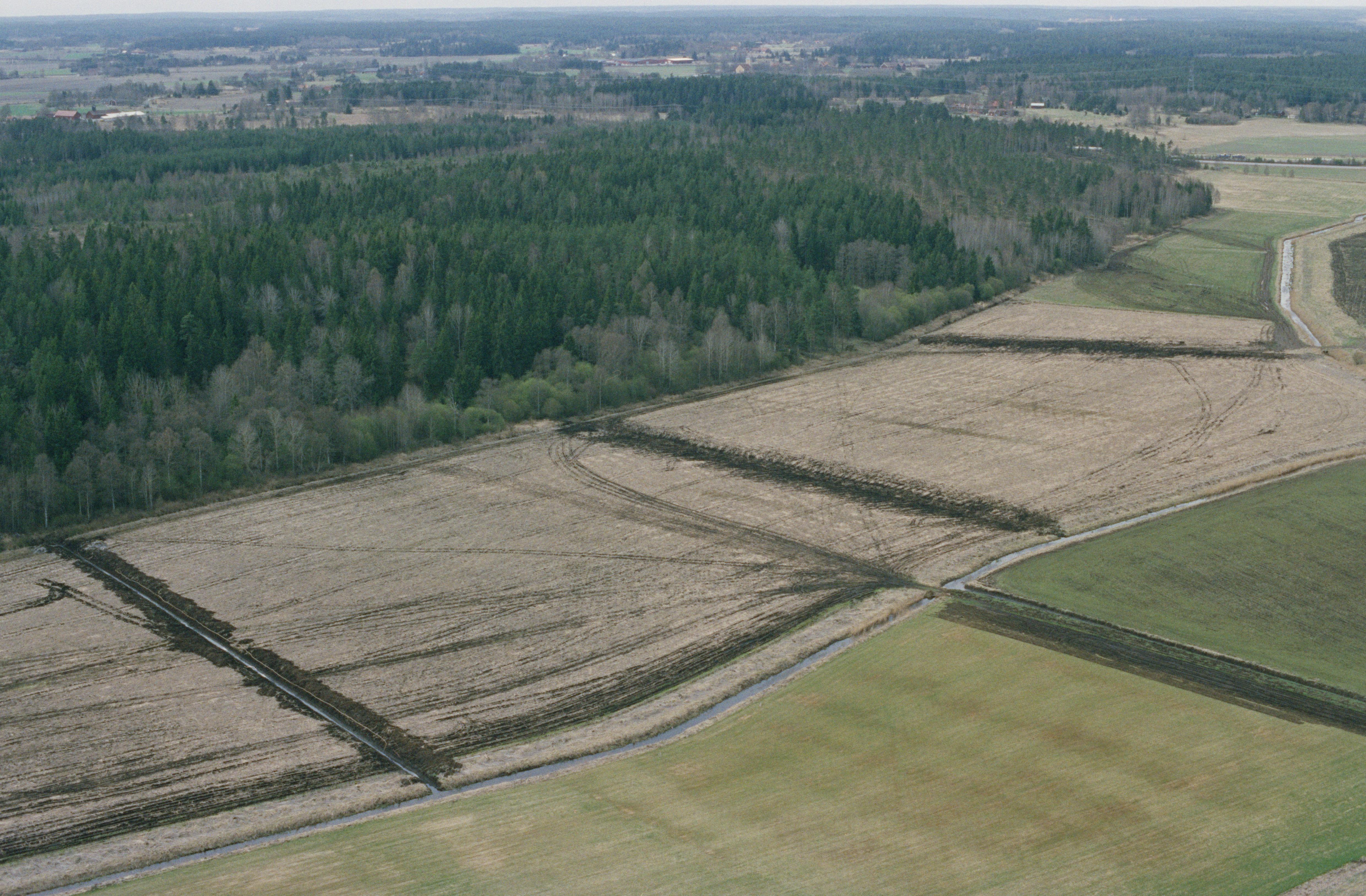 Beskrivning: Öster om Åslunda by och Svartsjön i Rickebyåns dalgång. Arkeologisk undersökning (provgrävningar vid bildens mitt) innan bygge av järnväg (Arlandabanan). Över bildens mitt område med stenröse Odensala 4:1, m.fl. Bilden är tagen mot (väderstreck): SV