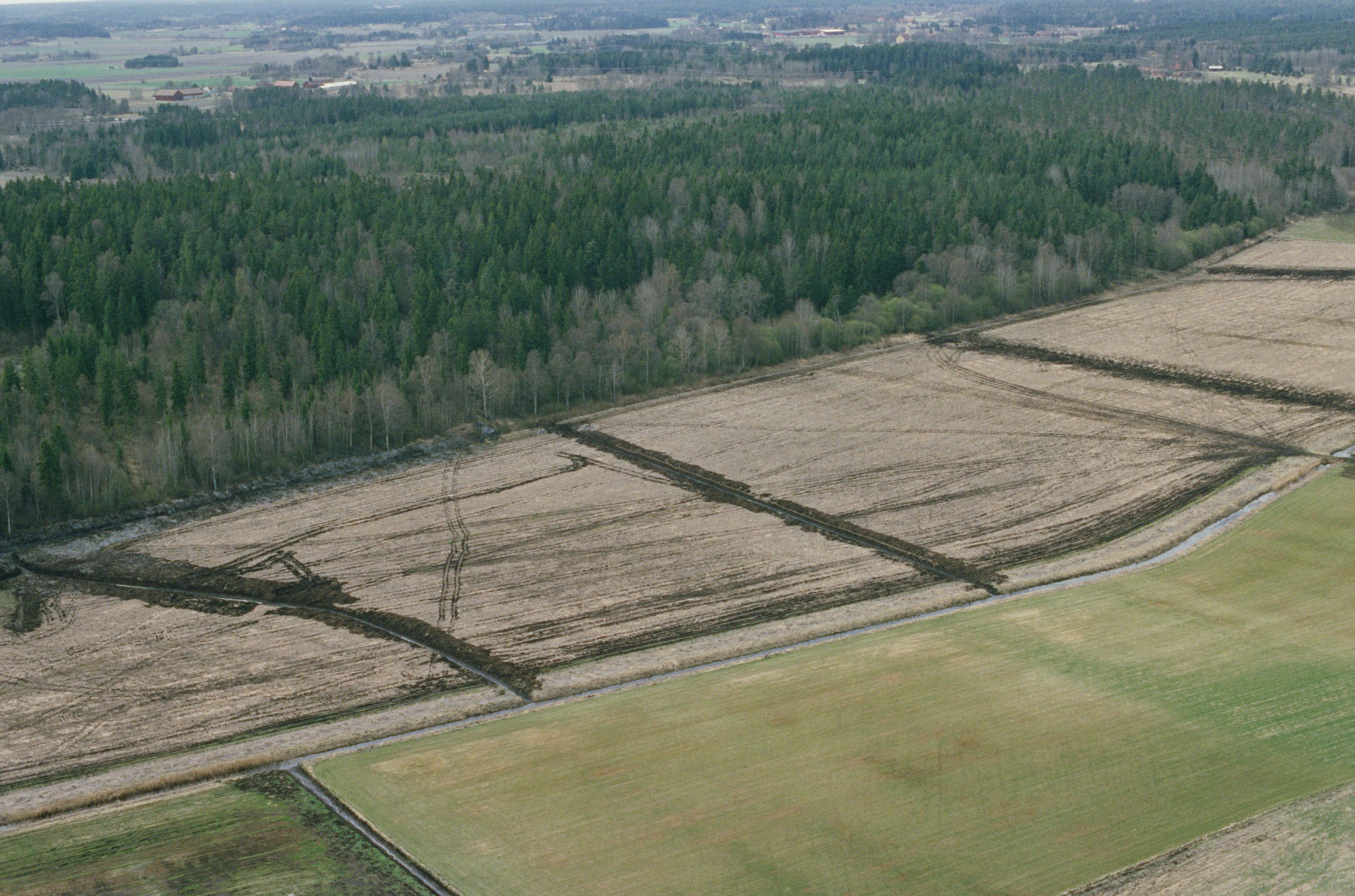 Beskrivning: Öster om Åslunda by och Svartsjön i Rickebyåns dalgång. Arkeologisk undersökning (provgrävningar vid bildens mitt) innan bygge av järnväg (Arlandabanan). Över bildens mitt område med stenröse Odensala 4:1, m.fl. Bilden är tagen mot (väderstreck): SV