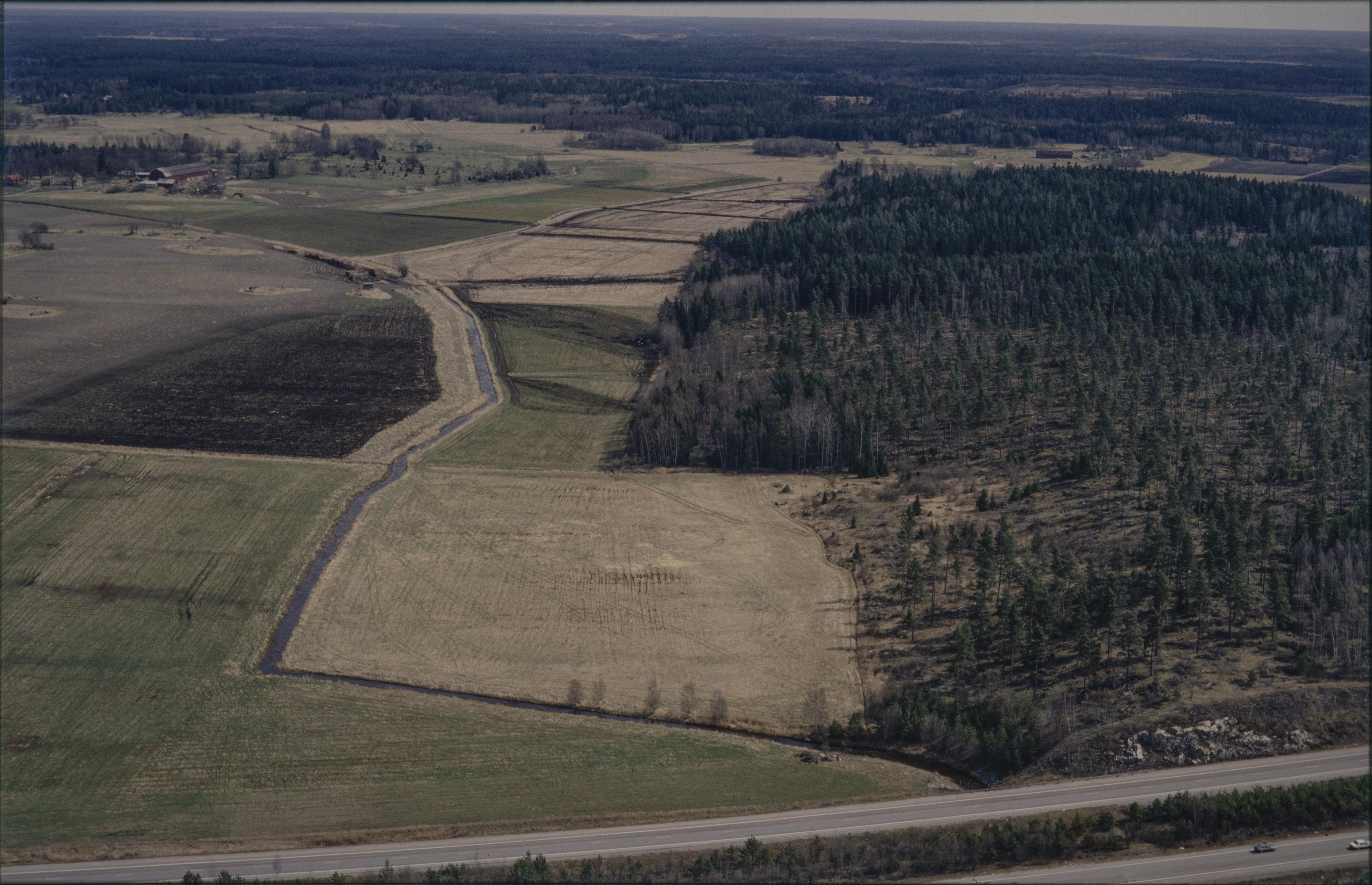 Beskrivning: Rickebyåns dalgång vid Åslunda mot Söderby innan bygge av järnväg (Arlandabanan) sydost om Svartsjön. Över bildens mitt till vänster fossil åker RAÄnr Odensala 370:1 och till höger fornborg RAÄnr Odensala 405:1 och nere till höger boplats med hägnad RAÄnr Odensala 401:1-3 m.fl. Bilden är tagen mot (väderstreck): ONO