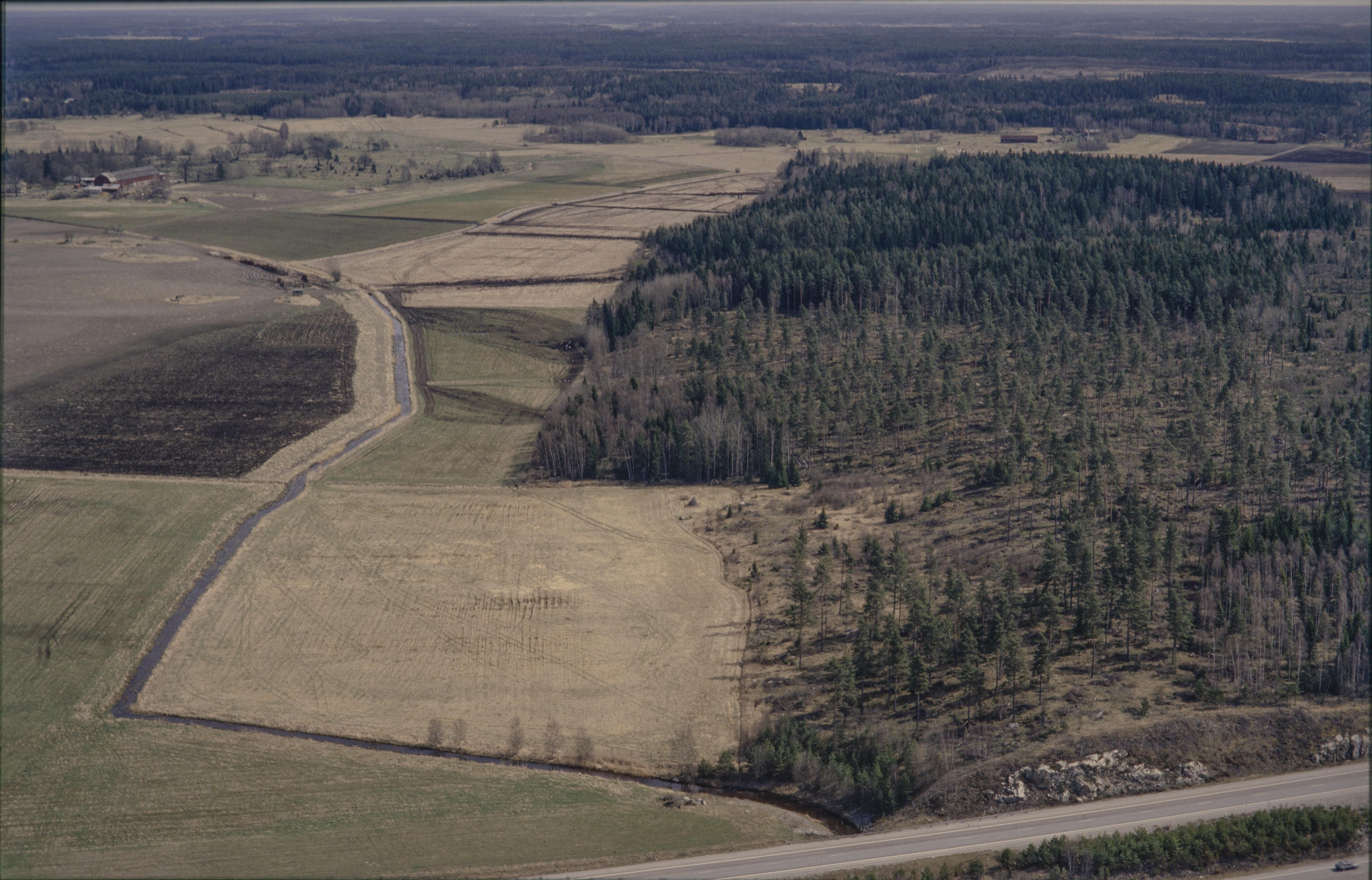 Beskrivning: Rickebyåns dalgång vid Åslunda mot Söderby innan bygge av järnväg (Arlandabanan) sydost om Svartsjön. Över bildens mitt till vänster fossil åker RAÄnr Odensala 370:1 och till höger fornborg RAÄnr Odensala 405:1 och nere till höger boplats med hägnad RAÄnr Odensala 401:1-3 m.fl. Bilden är tagen mot (väderstreck): ONO