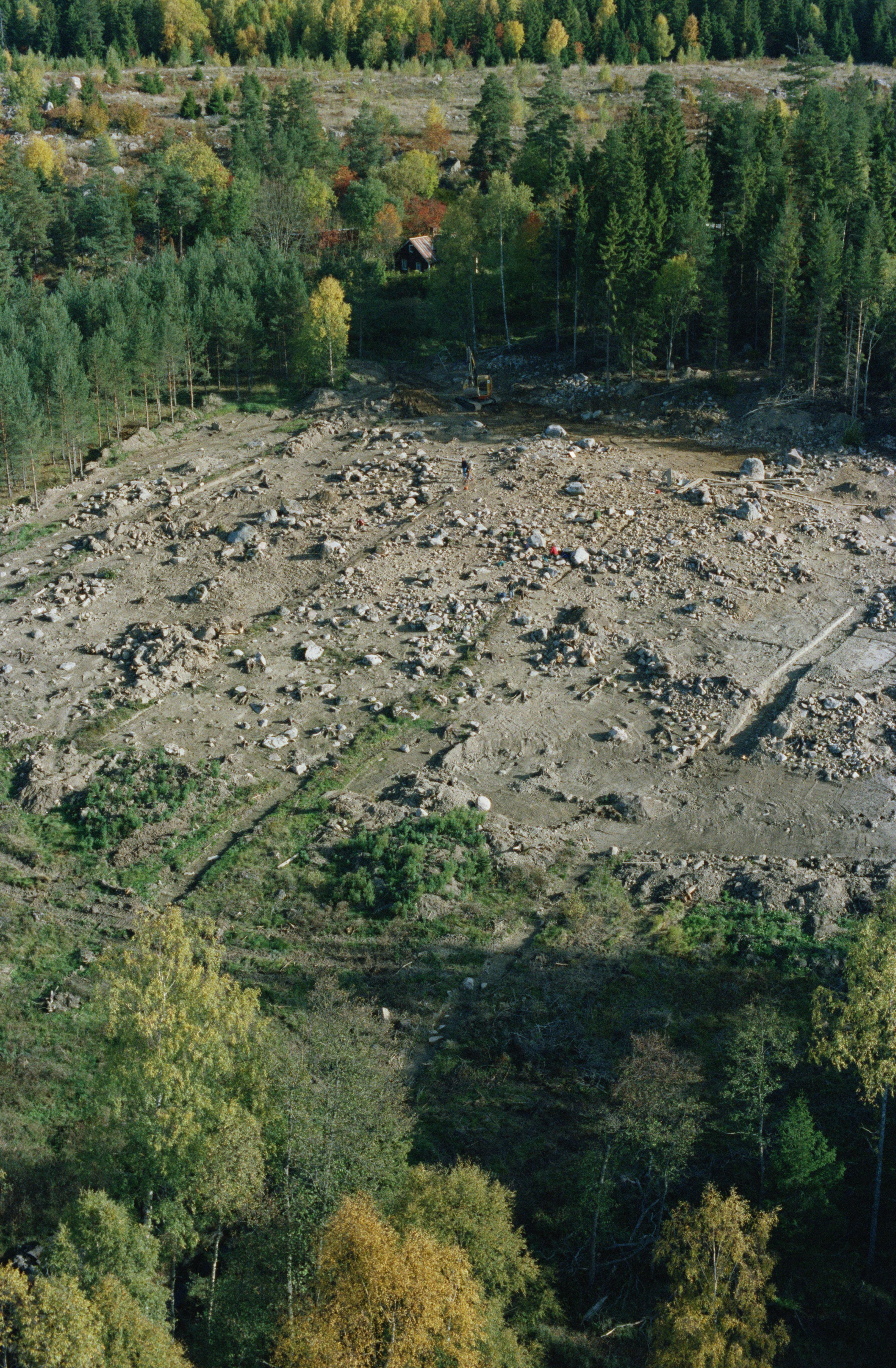 Beskrivning: Rössberga innan bygge av järnväg (Arlandabanan) i Rickebyåns dalgång. Arkeologisk undersökning av boplats RAÄnr Odensala 403:1. I bildens övre del fornborg Odensala 159:1. Bilden är tagen mot (väderstreck): NO