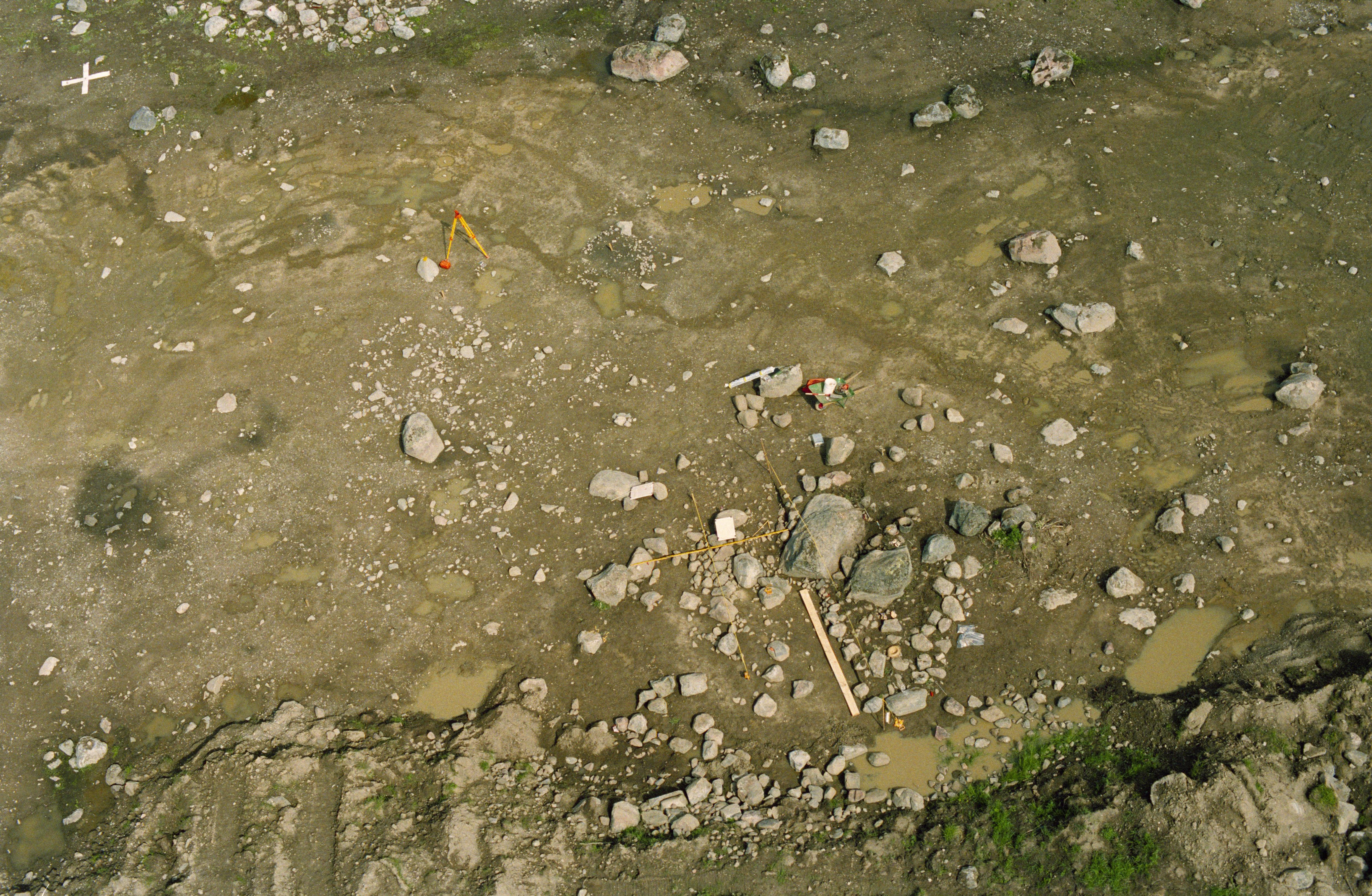 Beskrivning: Arkeologisk undersökning innan bygge av järnväg (Arlandabanan) i Rickebyåns dalgång vid Åslunda by sydost om Svartsjön. Bo- och gravplats RAÄnr Odensala 11:1, 13:1 och 402:1-2 m.fl. Bilden är tagen mot (väderstreck): N