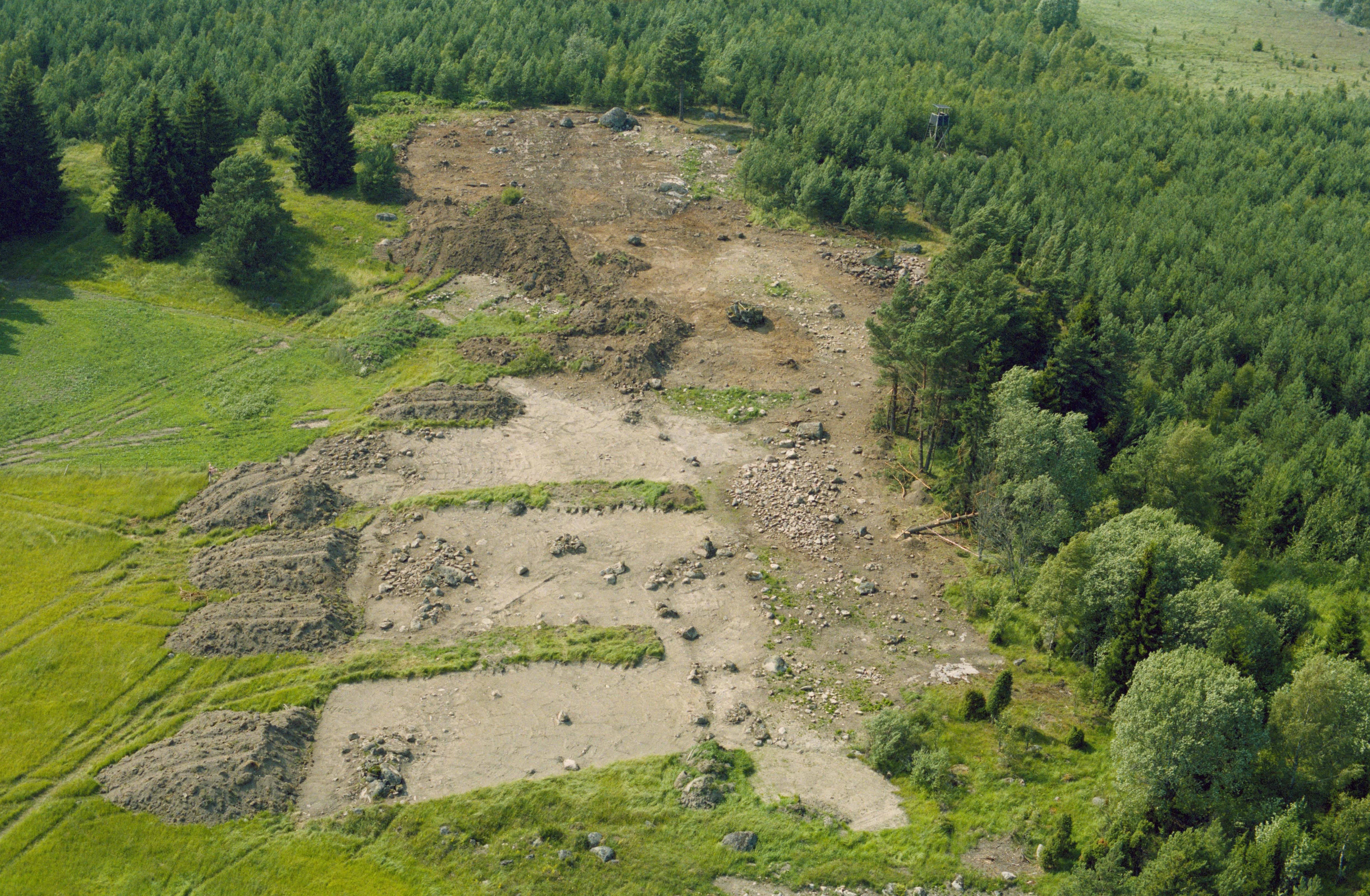 Beskrivning: Arkeologisk undersökning öster om Rickebyåns dalgång innan bygge av järnväg (Arlandabanan). Stensättning RAÄnr Odensala 236:1. i skogsområde öster om Sjötorpet, söder om Svartsjön, väster om Åslunda by. Bilden är tagen mot (väderstreck): V