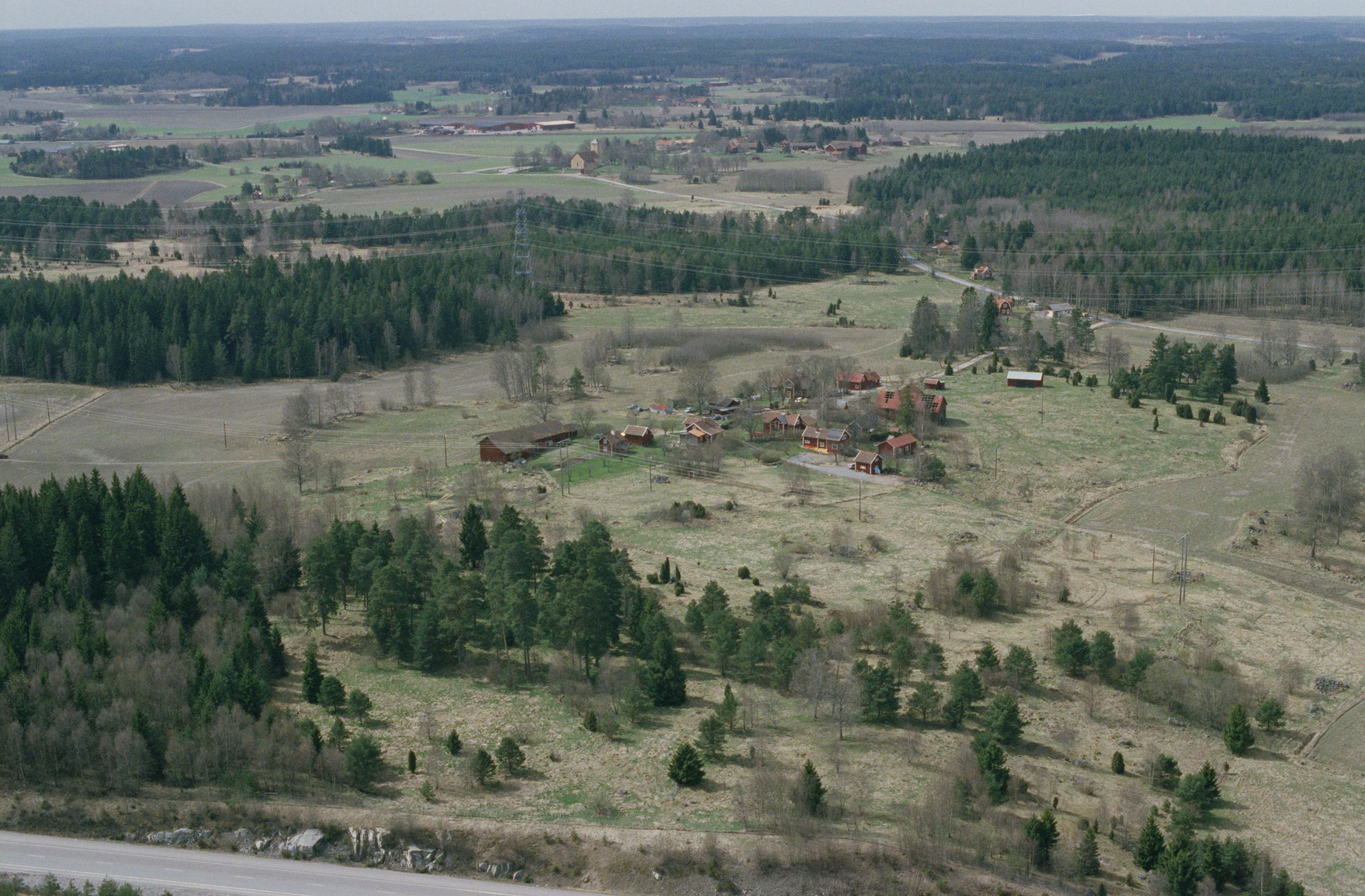 Beskrivning: Rickebyåns dalgång vid Åslunda by innan bygge av järnväg (Arlandabanan) sydost om Svartsjön. Längs bildens mitt bo- och gravplats RAÄnr Odensala 6:1, 402:1-2, 11:1, och 13:1, boplats Odensala 489:1, m.fl. Bilden är tagen mot (väderstreck): VSV