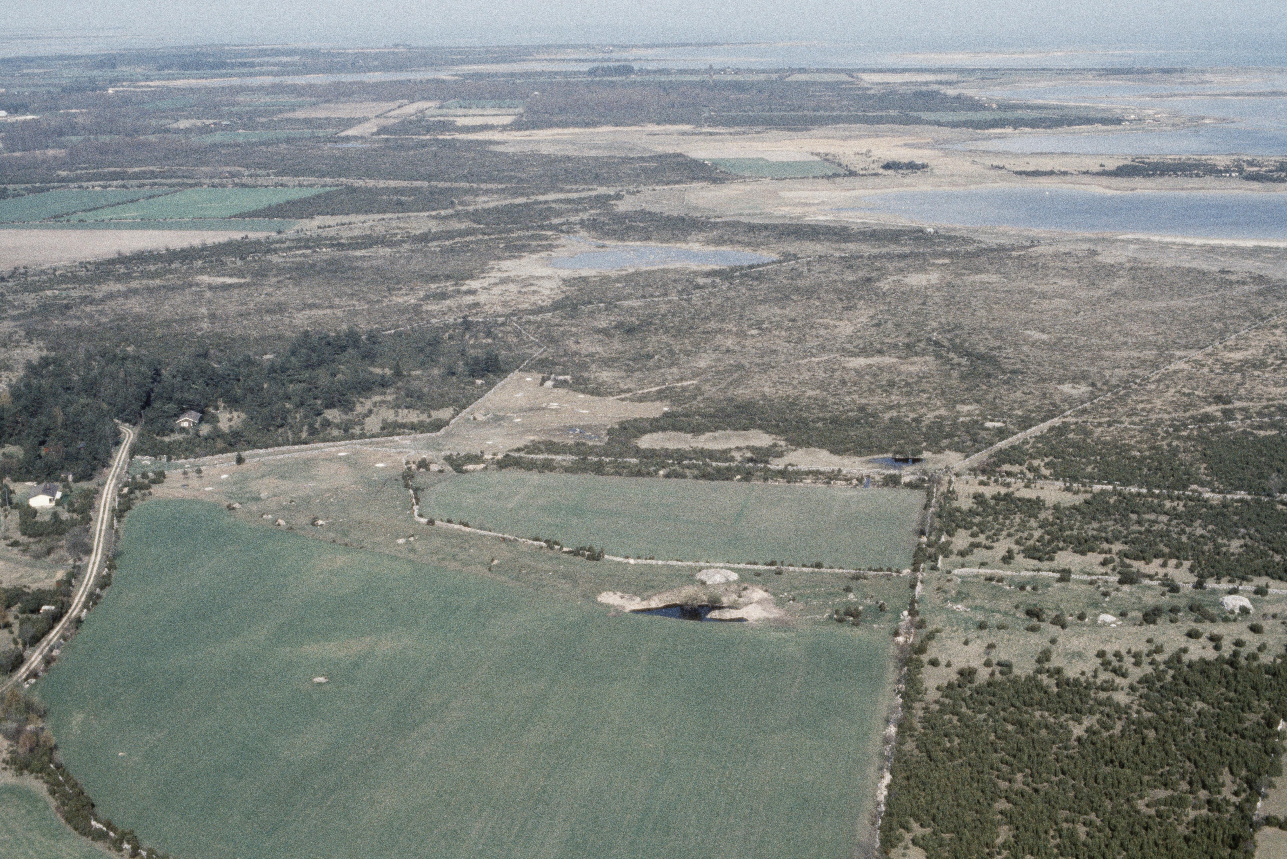 Beskrivning: Trullbjärg norrost om Djurstad. Boplats RAÄnr RAÄnr Föra 4:1, hägnader Föra 10:3 m.fl. Uppe till vänster Södra Greda, till höger Lilla Fjärden och näset Lillholm. Bilden är tagen mot (väderstreck): NO