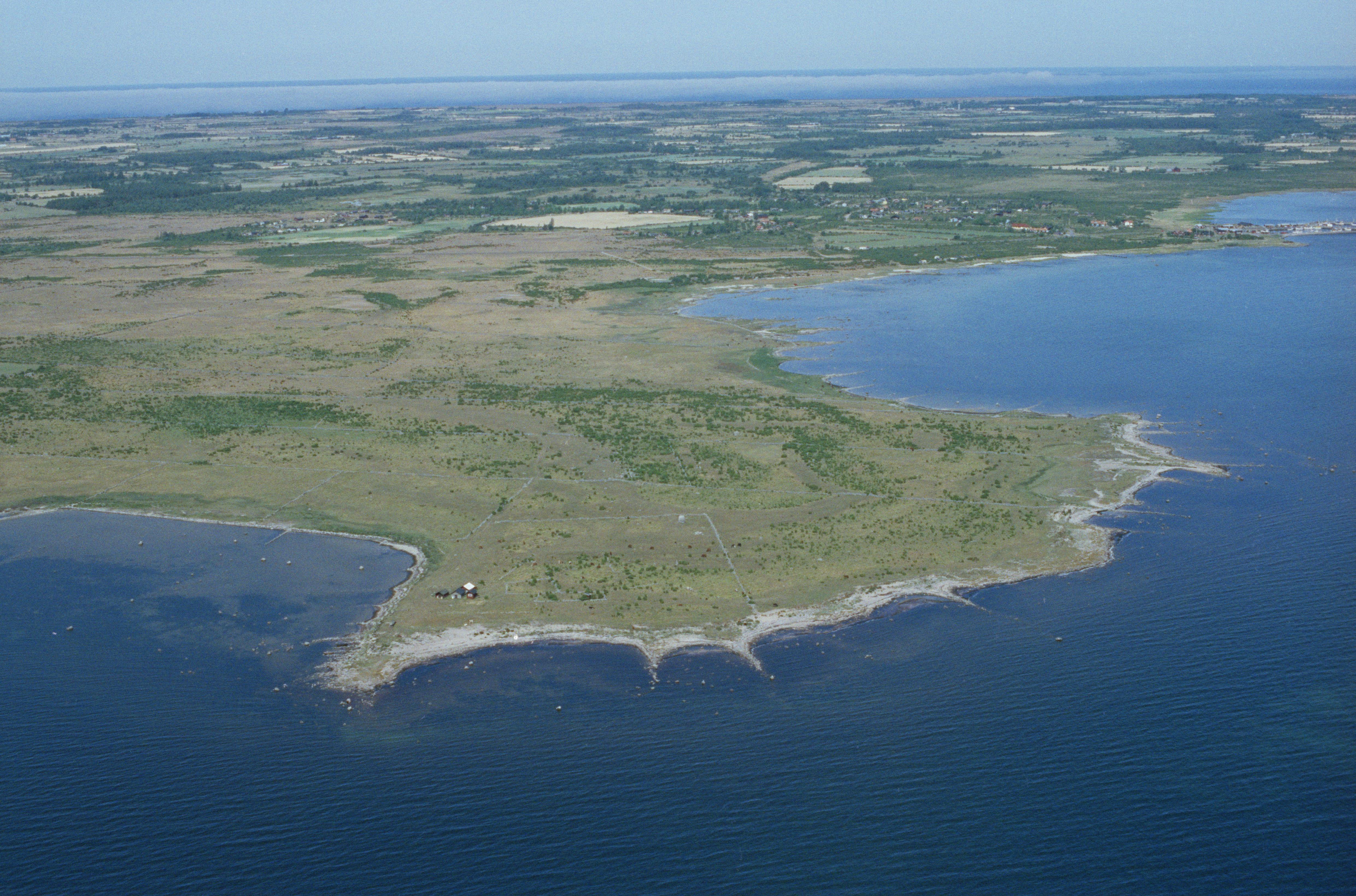 Beskrivning: Vid bildens mitt kor på bete på udden Varholm. Till höger i bildens övre del fiskeläget Kårehamn vid Karsevik. Bilden är tagen mot (väderstreck): NV