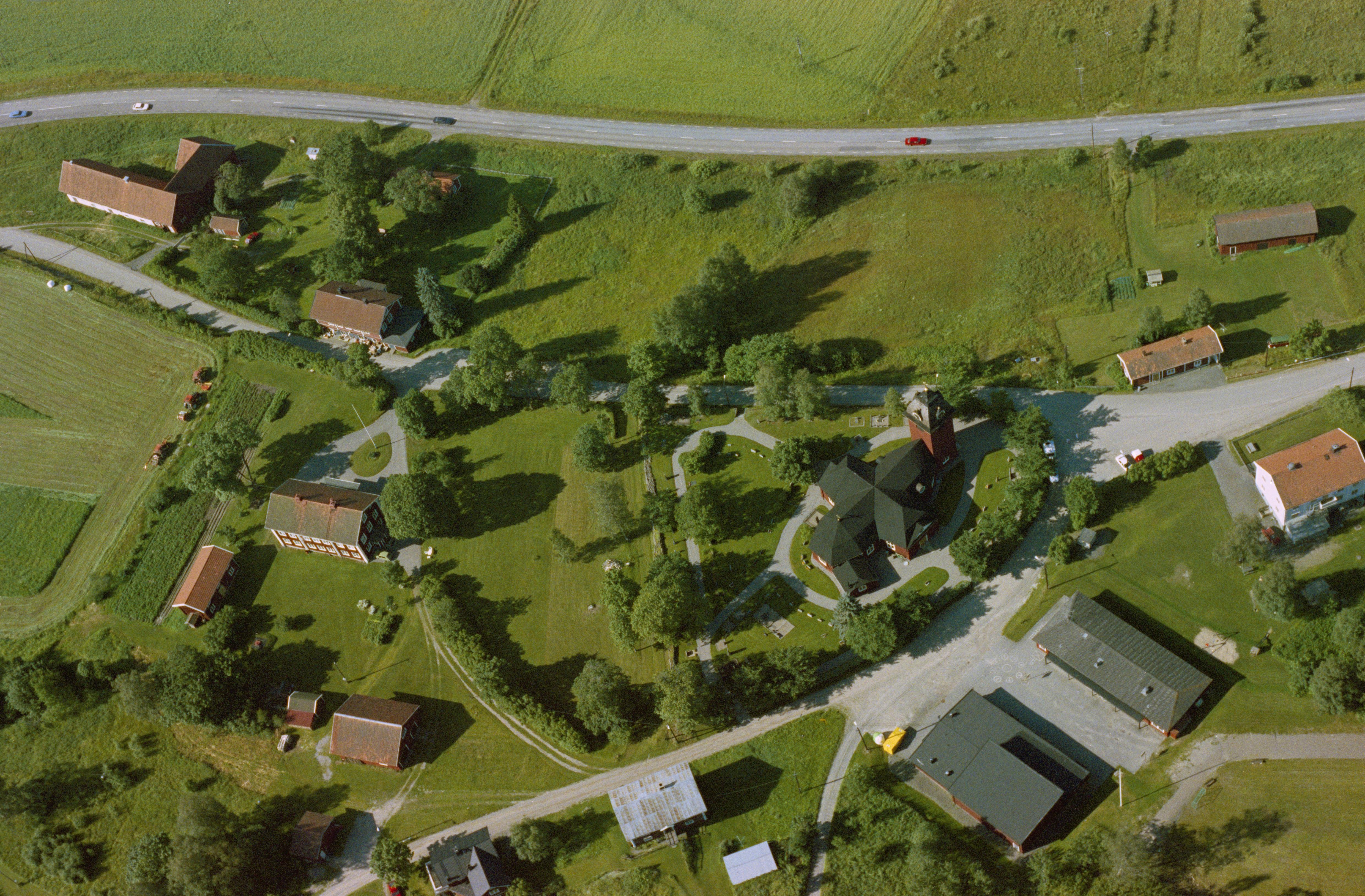 Beskrivning: Hjulsjö kyrkby. Hjulsjö kyrka till höger om bildens mitt. Bilden är tagen mot (väderstreck): SV