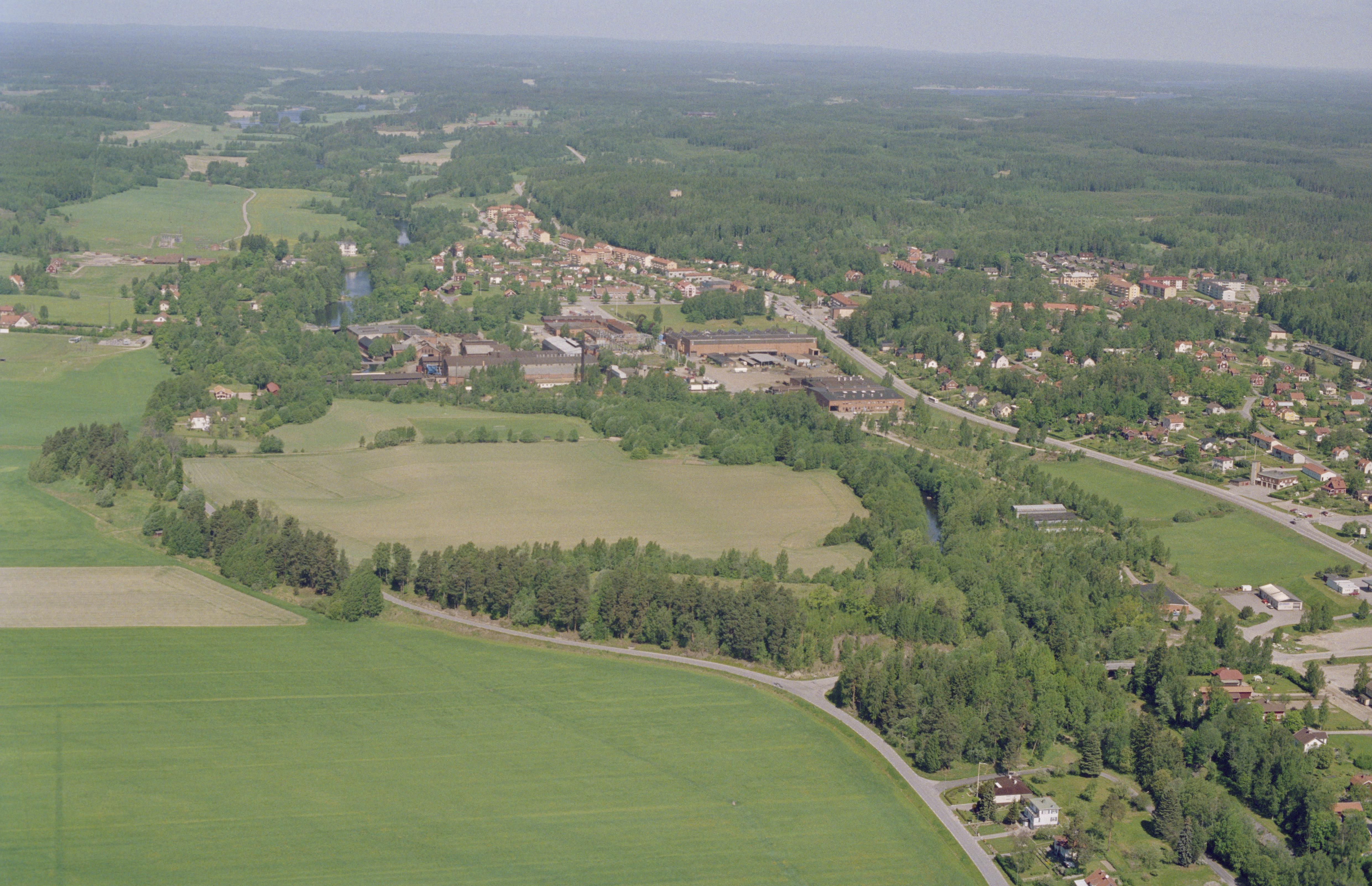 Beskrivning: Hedströmmen vid Kolsva bruk och tätort. Till vänster över bildens mitt Kolsva herrgård (skrivs även Kohlswa herrgård) och till höger Kolsva brukskyrka. I skogen uppe till höger fornborg RAÄnr Kolsva 63:1. Bilden är tagen mot (väderstreck): N