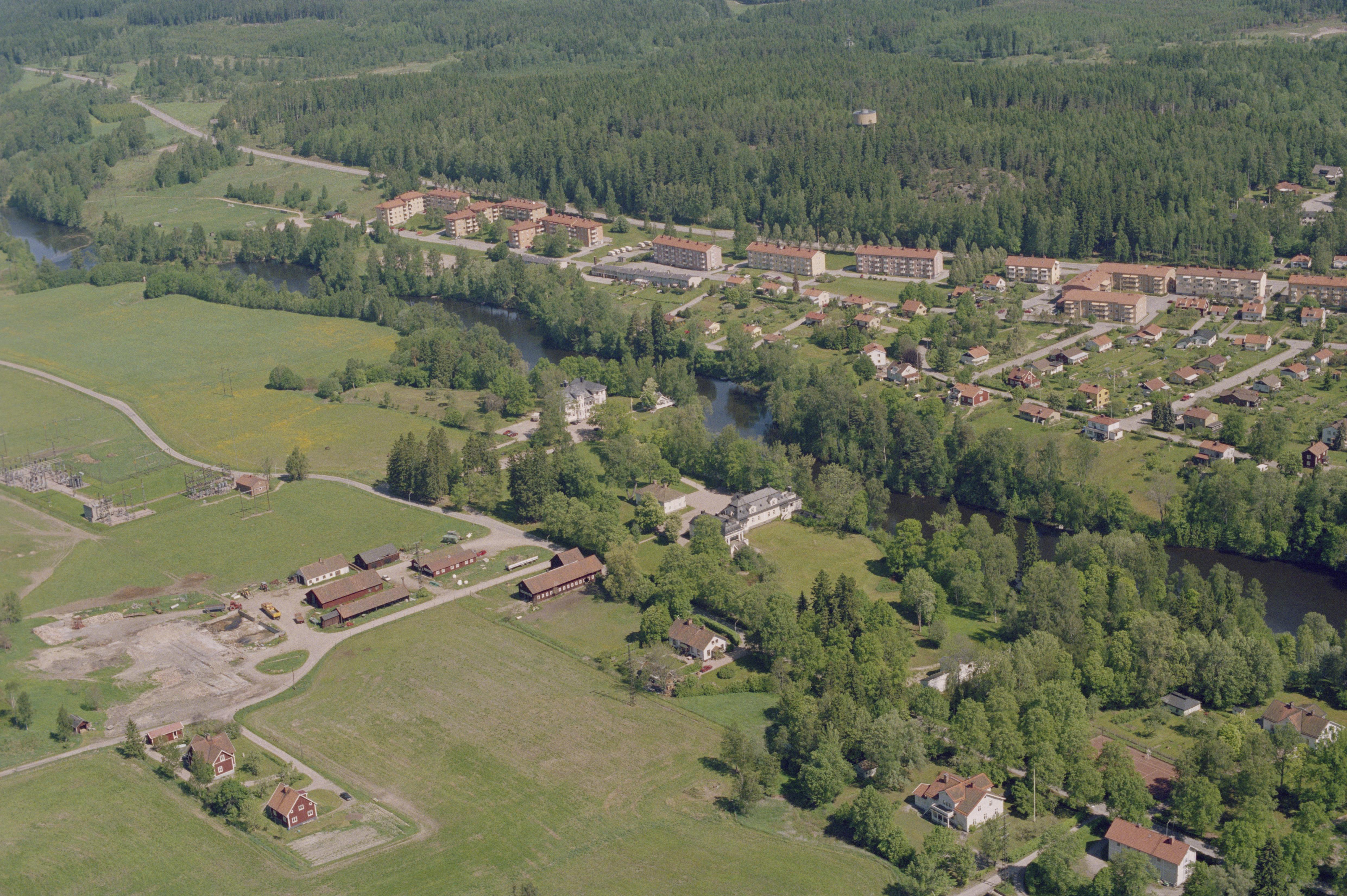 Beskrivning: Hedströmmen vid Kolsva bruk och tätort. Till vänster om bildens mitt Kolsva herrgård (skrivs även Kohlswa herrgård). Till vänster över bildens mitt fyndplats (yxor m.m.) RAÄnr Kolsva 251:1. Bilden är tagen mot (väderstreck): NO