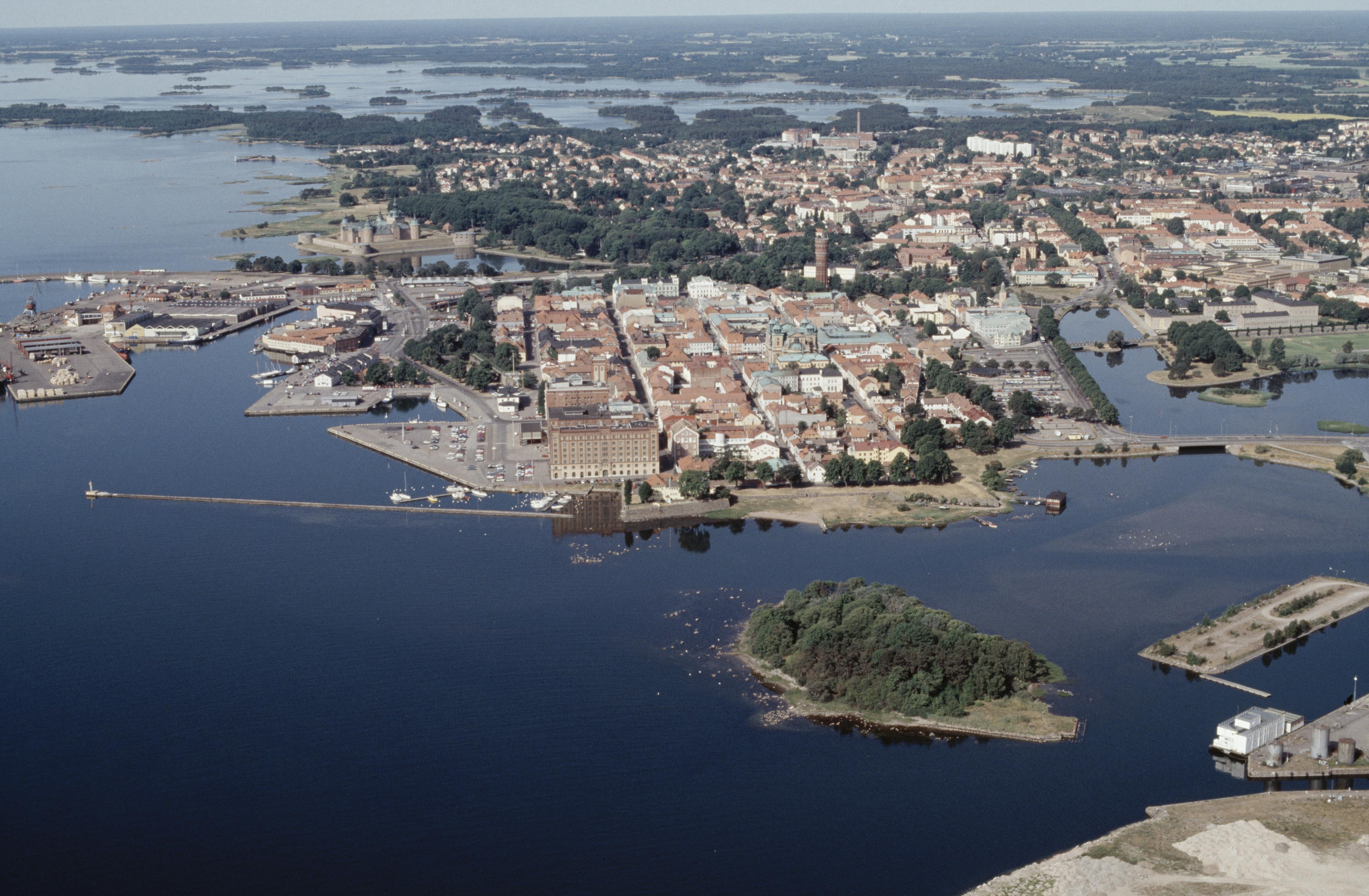Beskrivning: Kalmar stad. Kvarnholmen med Kalmar domkyrka vid bildens mitt. Uppe till vänster Kalmar slott / borg RAÄnr Kalmar 53:1. Bilden är tagen mot (väderstreck): SV