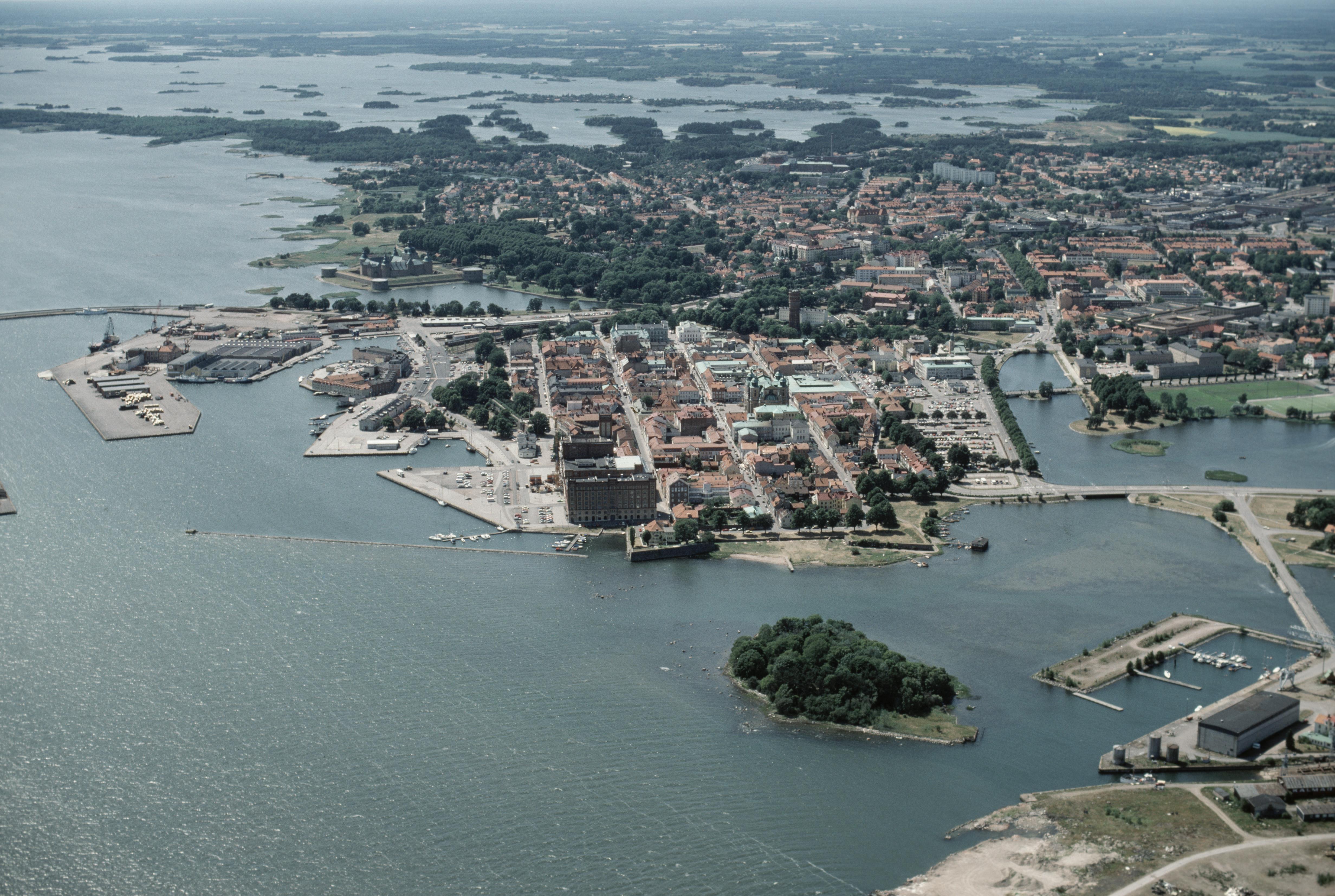Beskrivning: Kalmar stad. Kvarnholmen med Kalmar domkyrka vid bildens mitt. Uppe till vänster Kalmar slott / borg RAÄnr Kalmar 53:1. Bilden är tagen mot (väderstreck): SV