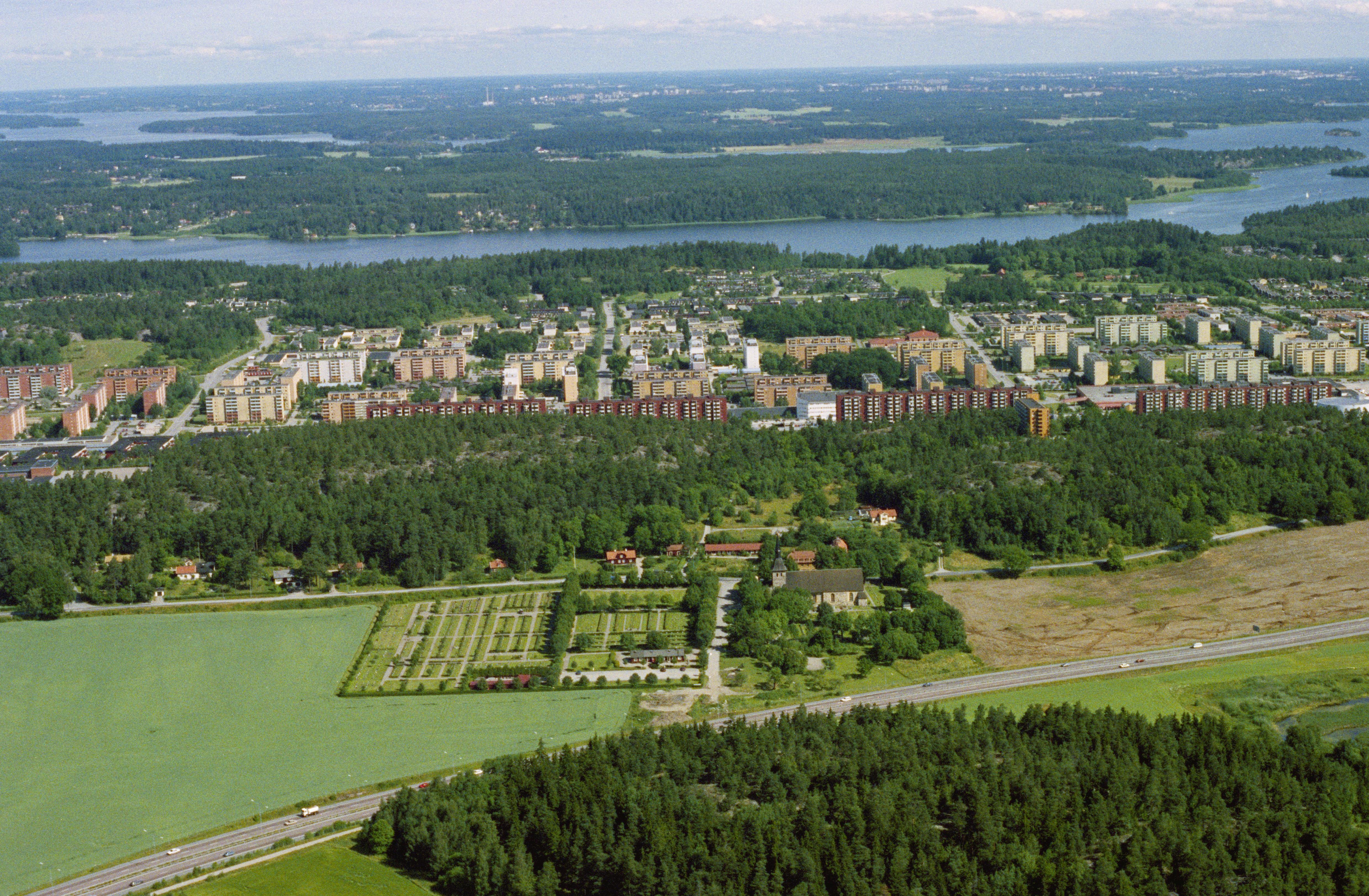 Beskrivning: Botkyrka kyrka vid bildens mitt. I bildens övre del förortsområderna Norsborg och Hallunda vid Rödstensfjärden i Mälaren mot Ekerö socken. Bilden är tagen mot (väderstreck): N
