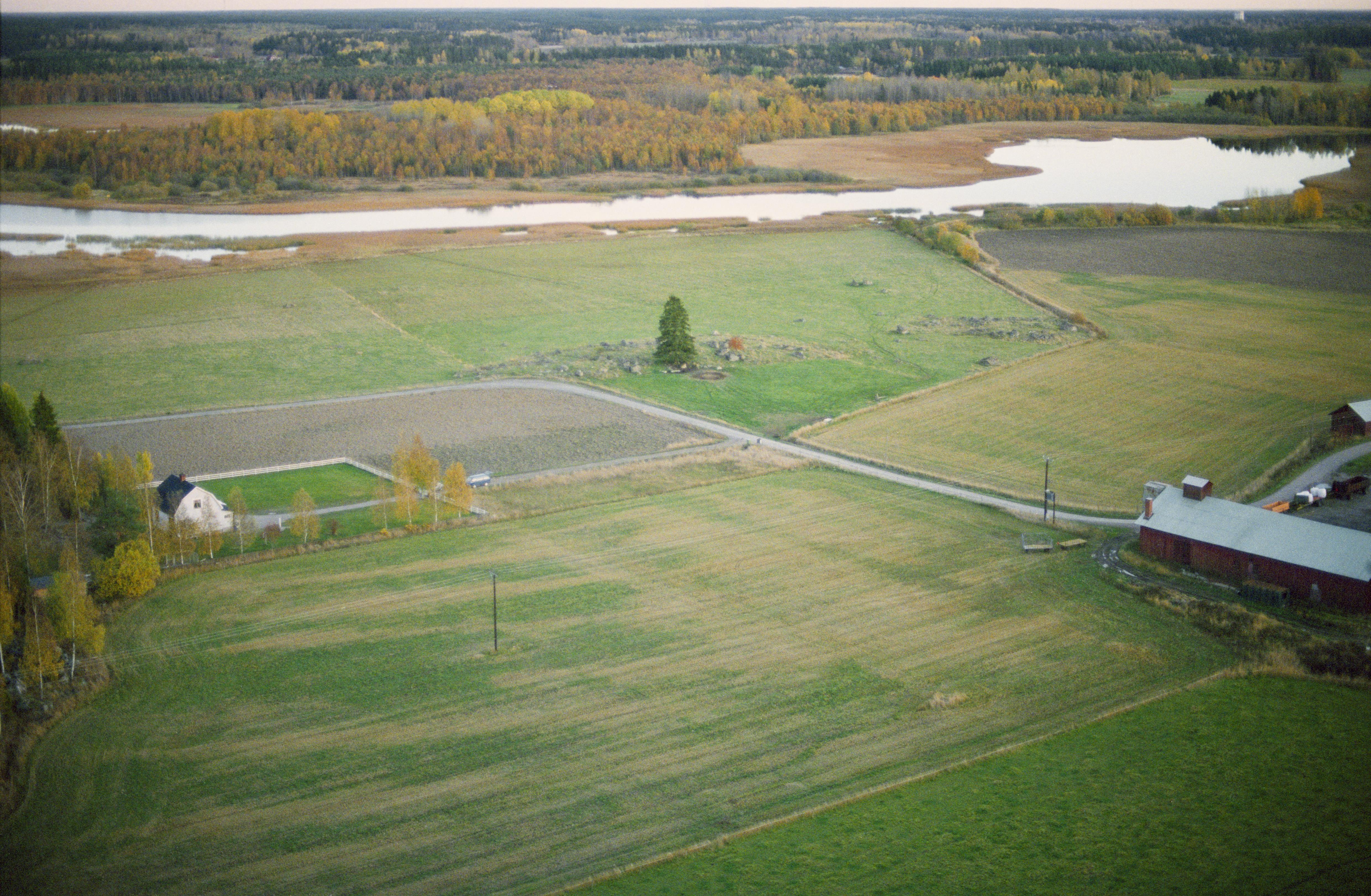 Beskrivning: Sörby gård vid sjön Gnien. Vid bildens mitt fornlämningsliknande (?) område öster om husgrund RAÄnr Ramnäs 237:1 (ej i bilden). Bilden är tagen mot (väderstreck): SO