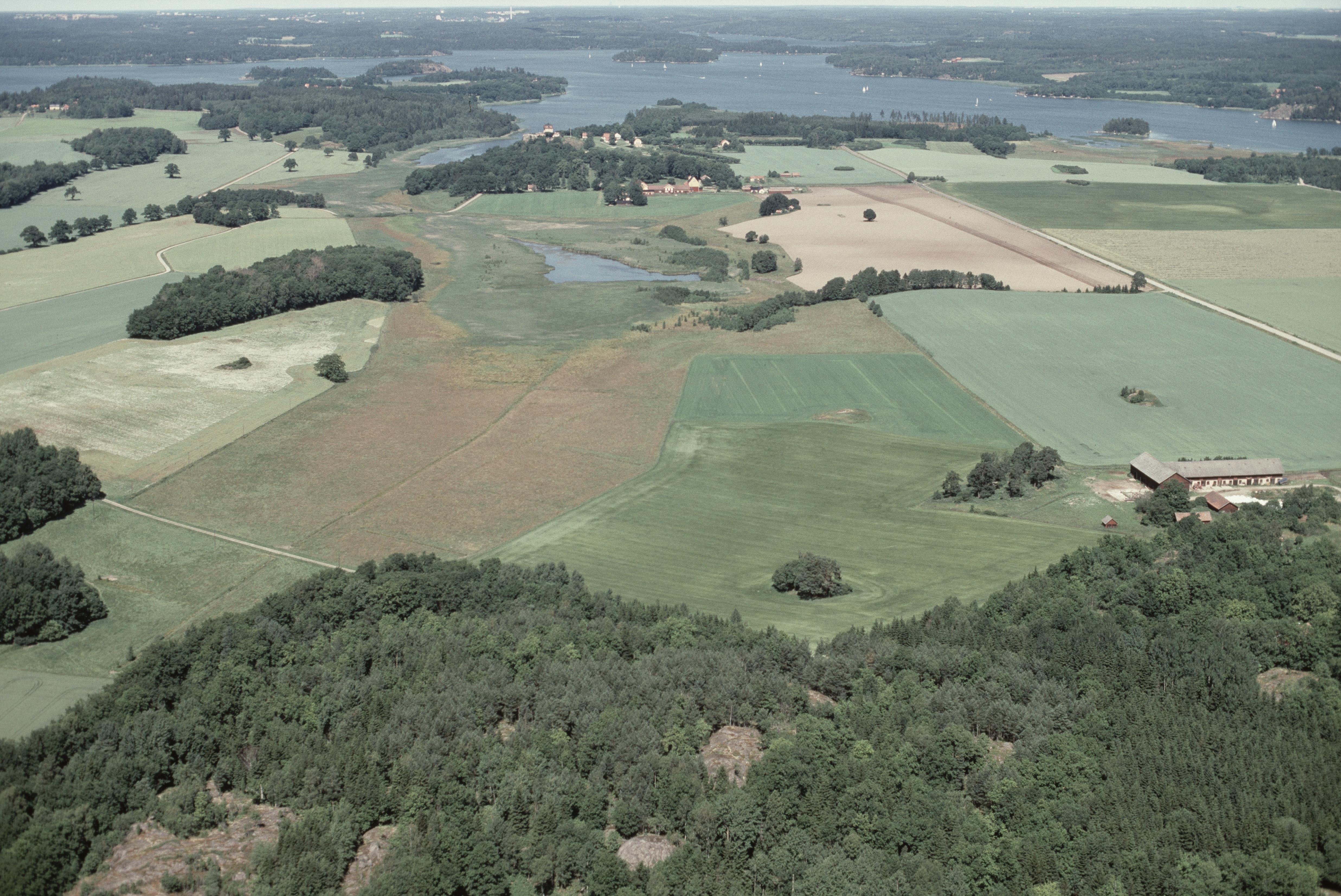 Beskrivning: Sanda gård nere till höger. Vid bildens mitt gravfält RAÄnr Mörkö 64:1. I bildens övre del Hörningsholms slott RAÄnr Mörkö 66:1, Borgsundet och Näslandsfjärden. Bilden är tagen mot (väderstreck): N