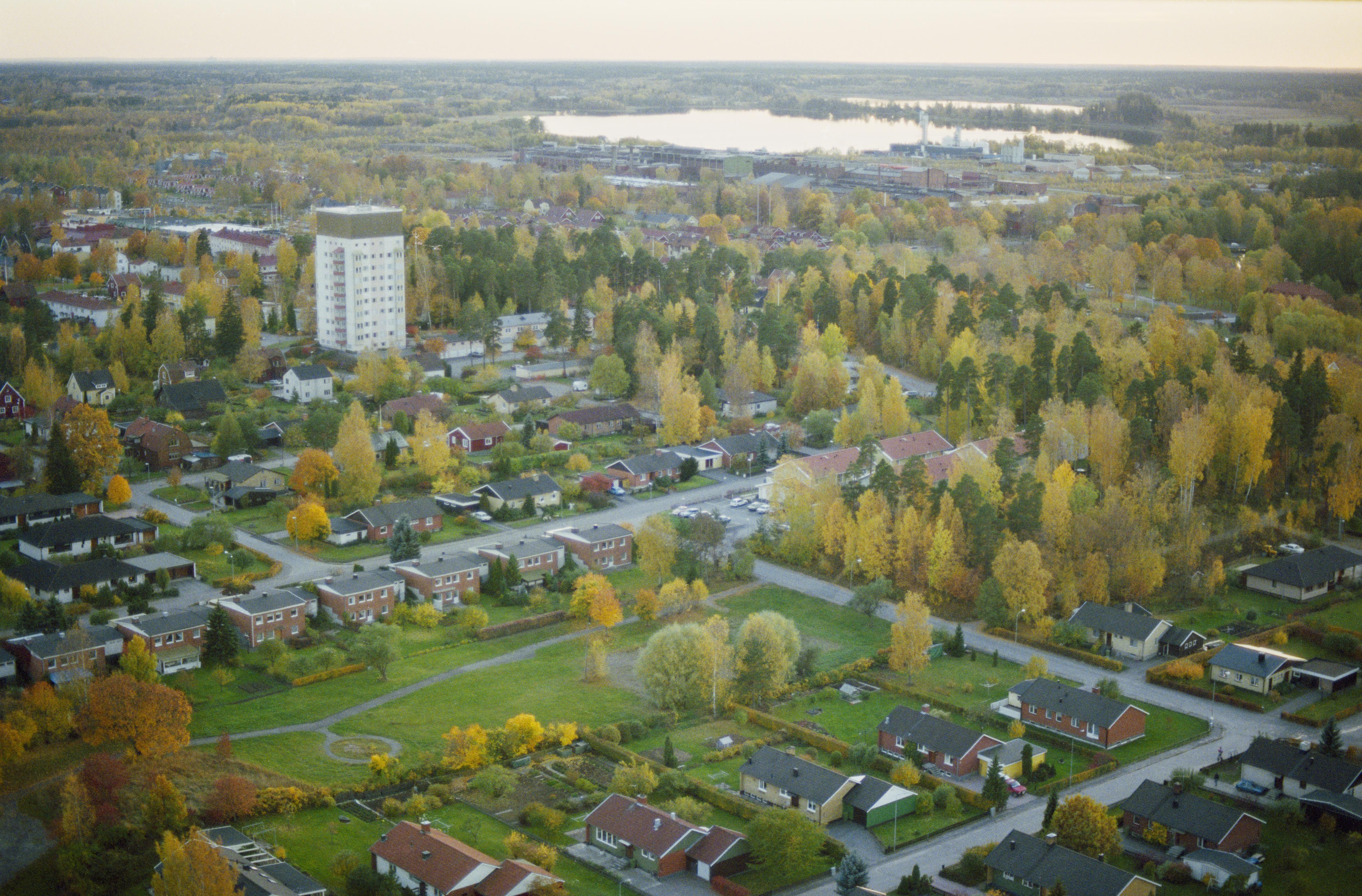 Beskrivning: Surahammars tätort och bruk RAÄnr Sura 49:1. Den höga byggnaden uppe till vänster står vid Skogsvägen och Bergsgatan. I bildens övre del Östersjön och byggnadsminnet Strömsholms kanal. Bilden är tagen mot (väderstreck): SSV