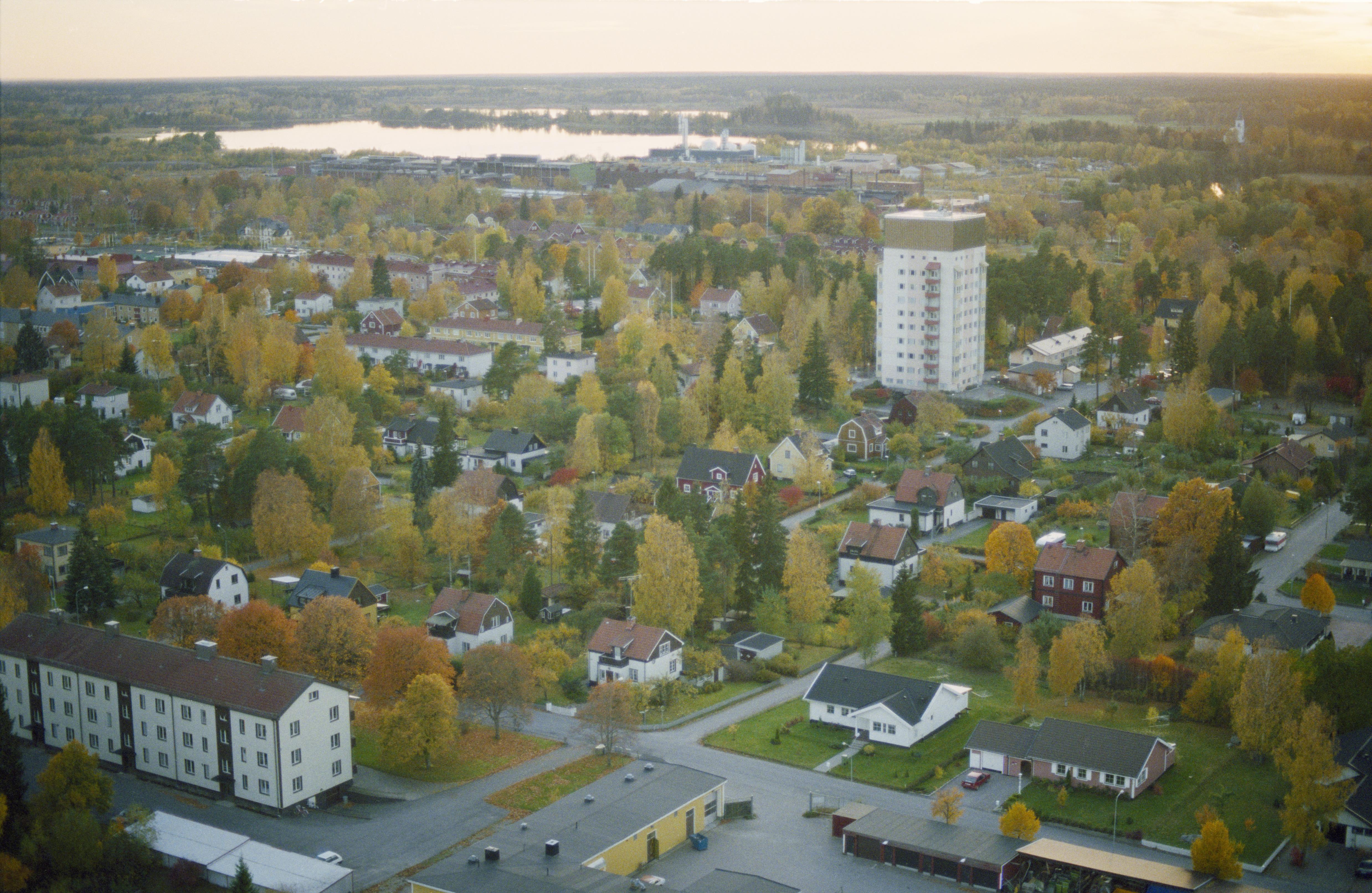 Beskrivning: Surahammars tätort och bruk RAÄnr Sura 49:1. Den höga byggnaden till höger står vid Skogsvägen och Bergsgatan. I bildens övre del Östersjön och byggnadsminnet Strömsholms kanal. Bilden är tagen mot (väderstreck): VSV