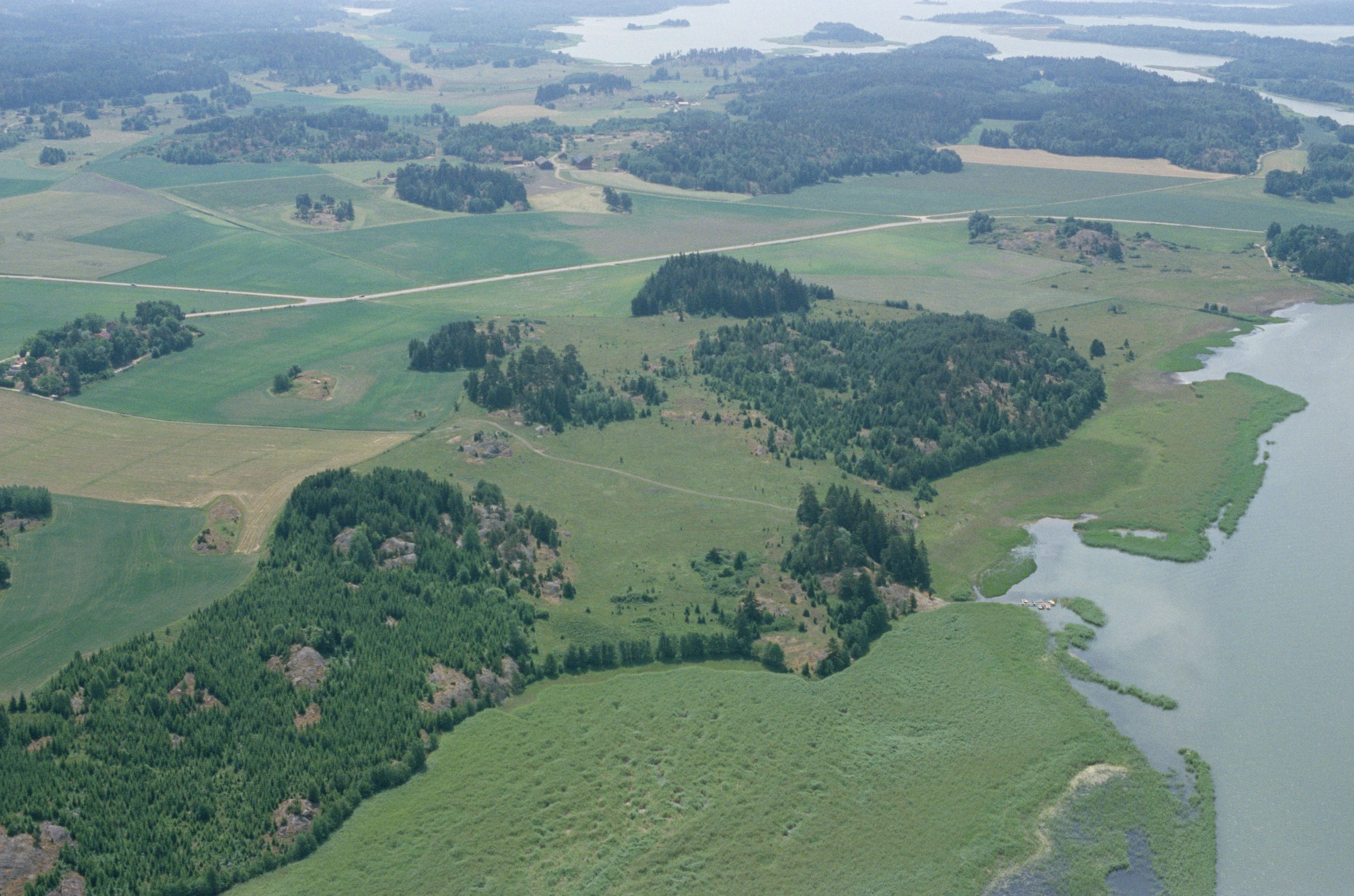 Beskrivning: Mörkö, västra delen. Ängar på Kasholmen vid Norafjärden. Vid bildens mitt gravfält RAÄnr Mörkö 82:1. Bilden är tagen mot (väderstreck): S