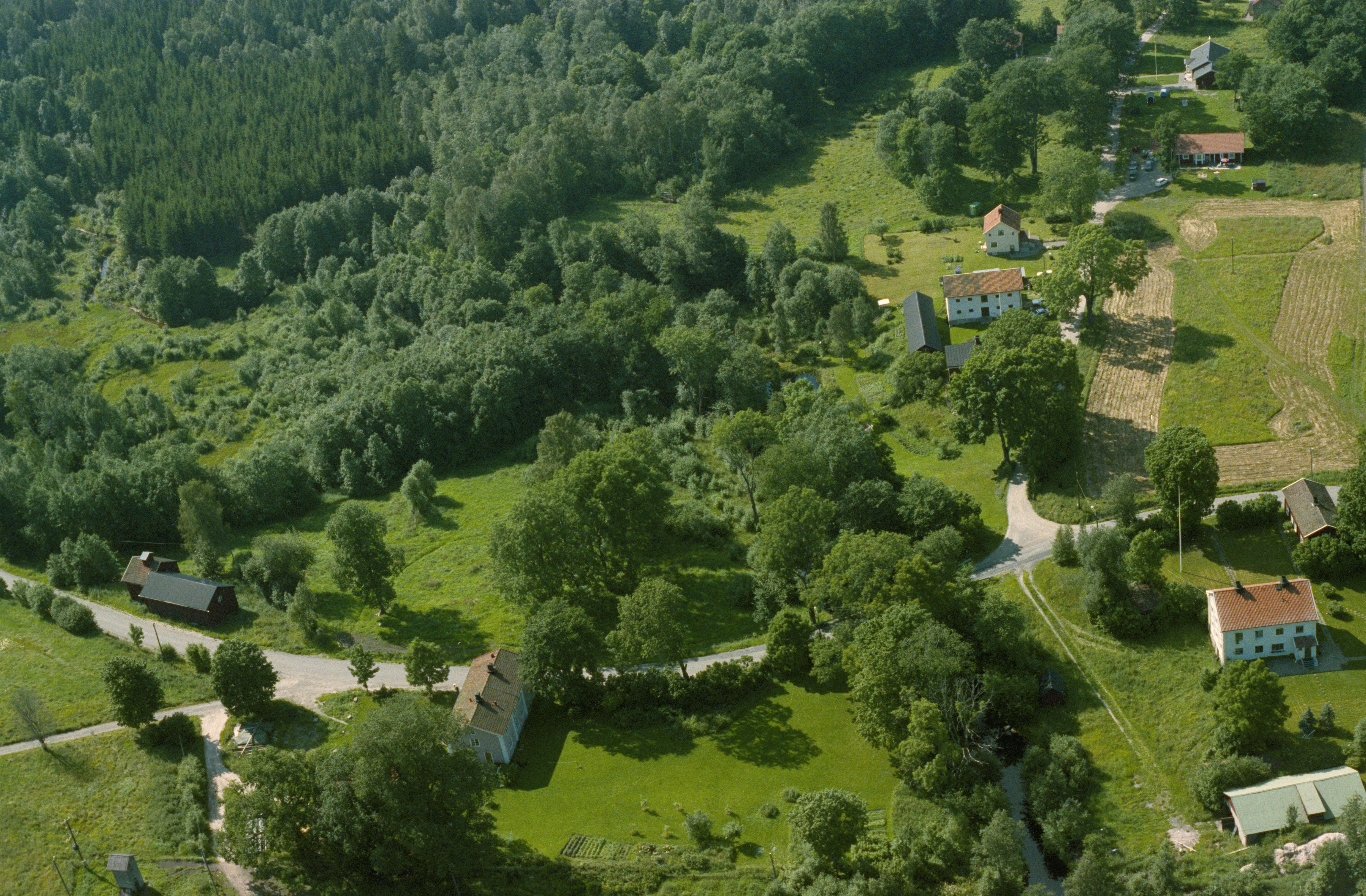 Beskrivning: Skrikarhyttans (skrivs även Skrekarhyttan) bergmansby i Mogruvälvens dalgång. Vid bildens mitt hyttområde RAÄnr Viker 11:1 vid bro Viker 82:1. Till vänster gruvområde RAÄnr Viker 90:1. Bilden är tagen mot (väderstreck): V