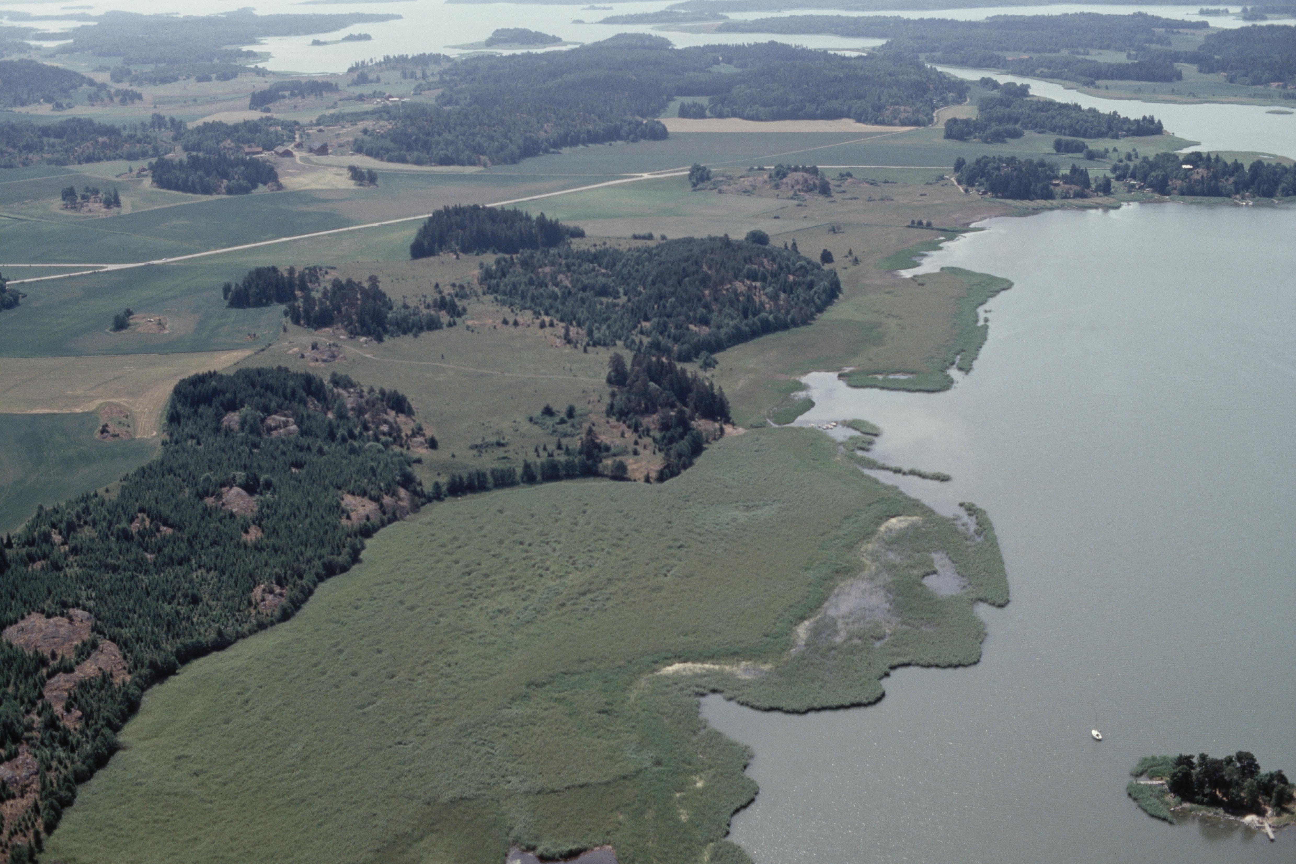 Beskrivning: Mörkö, västra delen. Ängar på Kasholmen vid Norafjärden. Vid bildens mitt gravfält RAÄnr Mörkö 82:1. Bilden är tagen mot (väderstreck): S