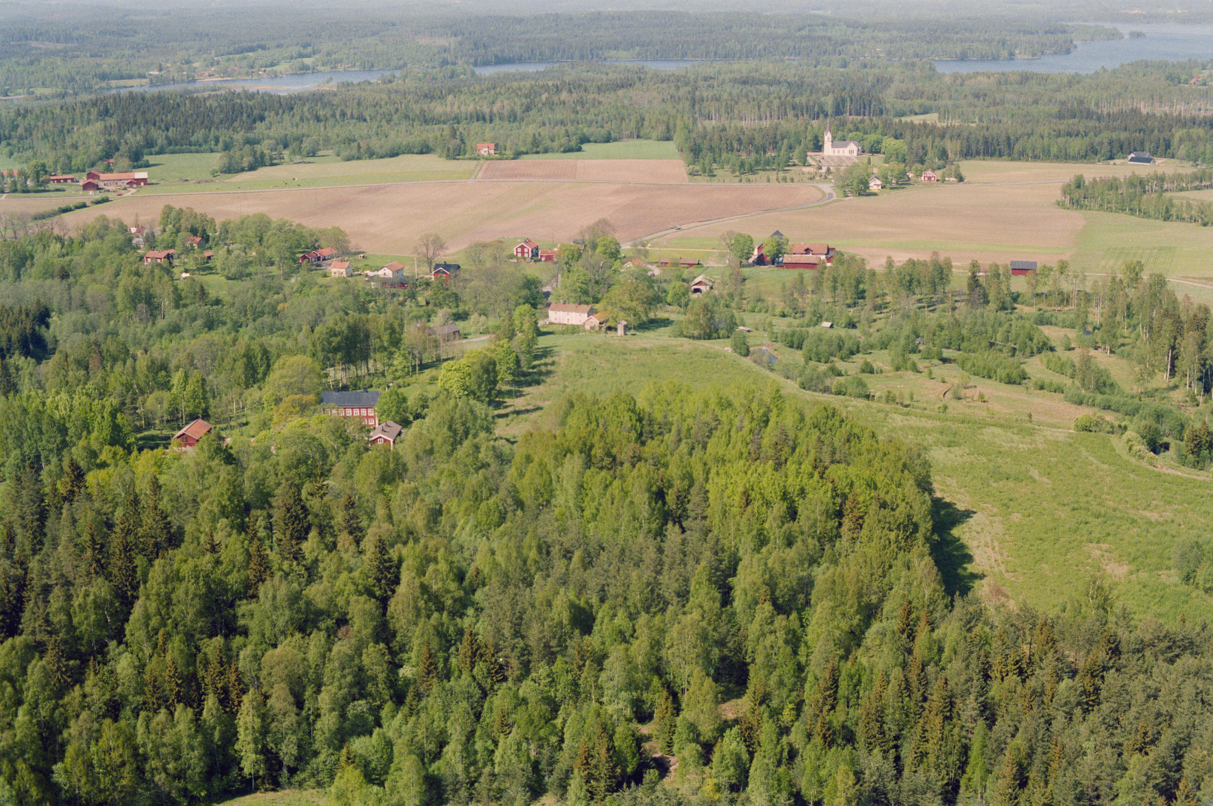 Beskrivning: Skrikarhyttans (skrivs även Skrekarhyttan) bergmansby i Mogruvälvens dalgång. Vid bildens mitt hyttområde RAÄnr Viker 11:1 vid bro Viker 82:1. I bildens nedre del gruvområde RAÄnr Viker 90:1. Vikers kyrka och sjön Vikern i bildens övre del. Bilden är tagen mot (väderstreck): N