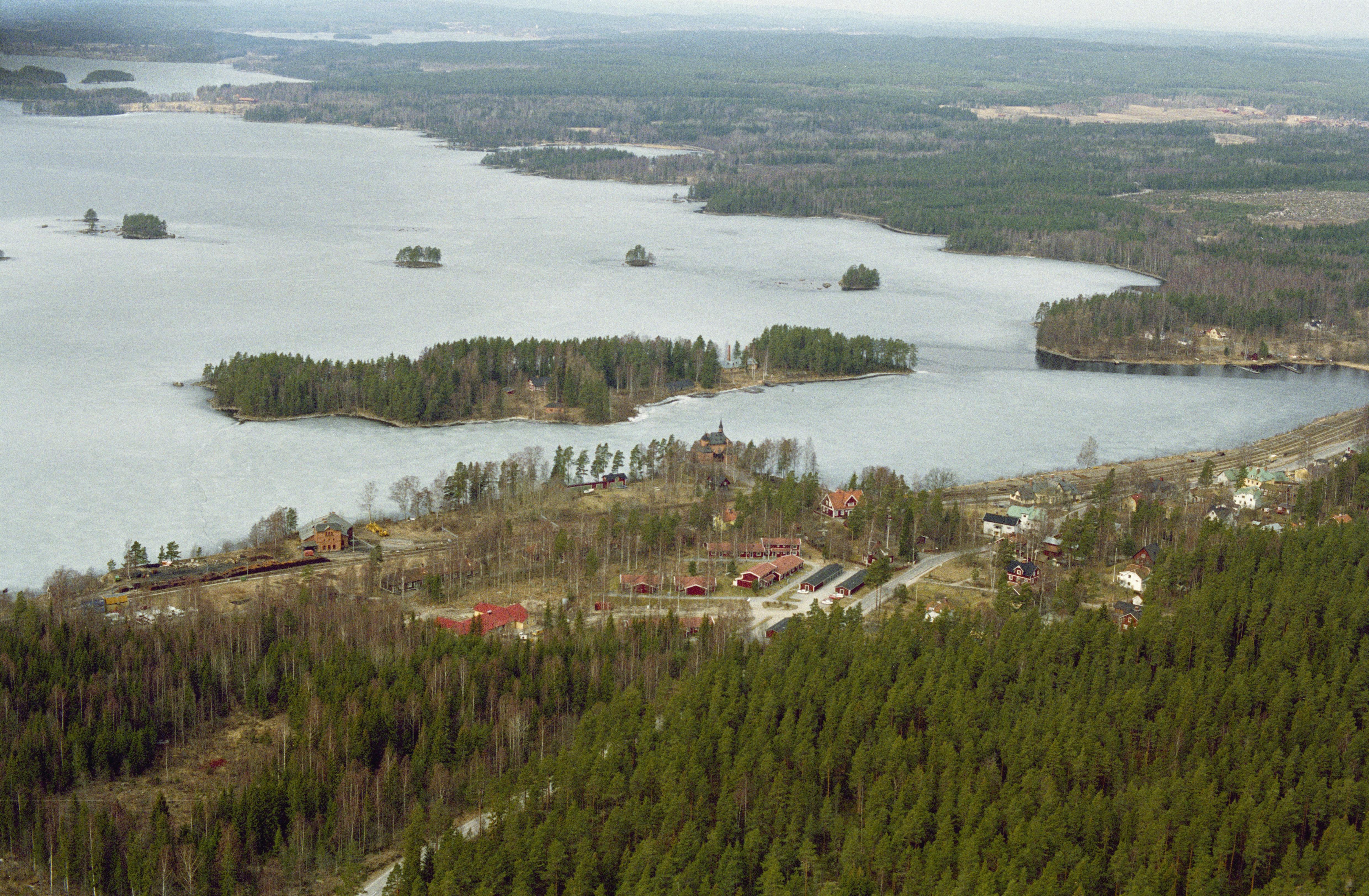 Beskrivning: Ängelsbergs by vid sjön Åmänningen. Över bildens mitt Oljeön, byggnadsminne RAÄnr Västervåla 83:1, med lämningar efter lysfotogenfabrik, bl.a. hyttor och hammare. Bilden är tagen mot (väderstreck): NV