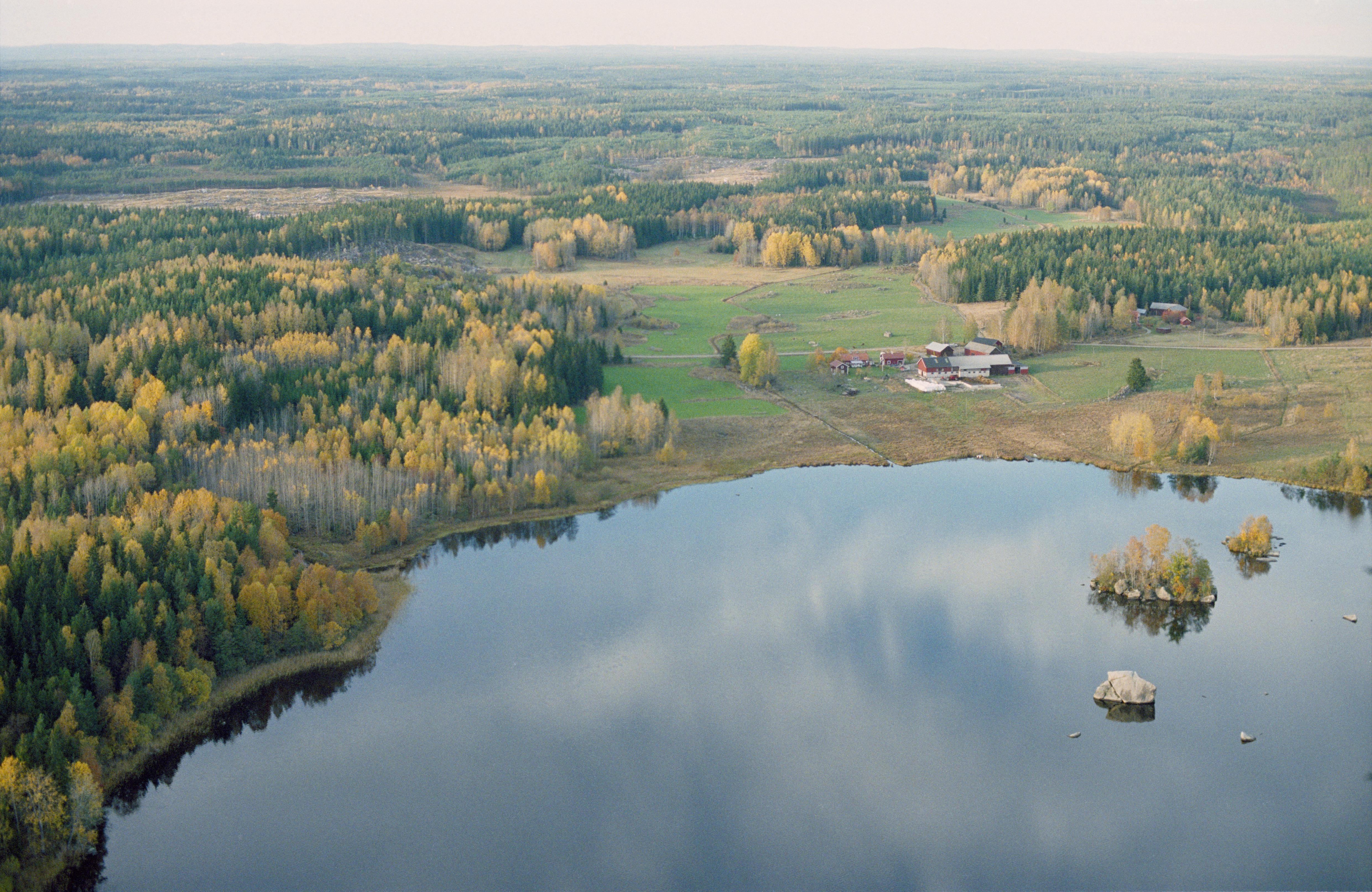 Beskrivning: Spaboda by vid sjön Spaden. Till vänster om bildens mitt område med slagg efter blästbruk RAÄnr Västra Skedvi 24:1. Bilden är tagen mot (väderstreck): N