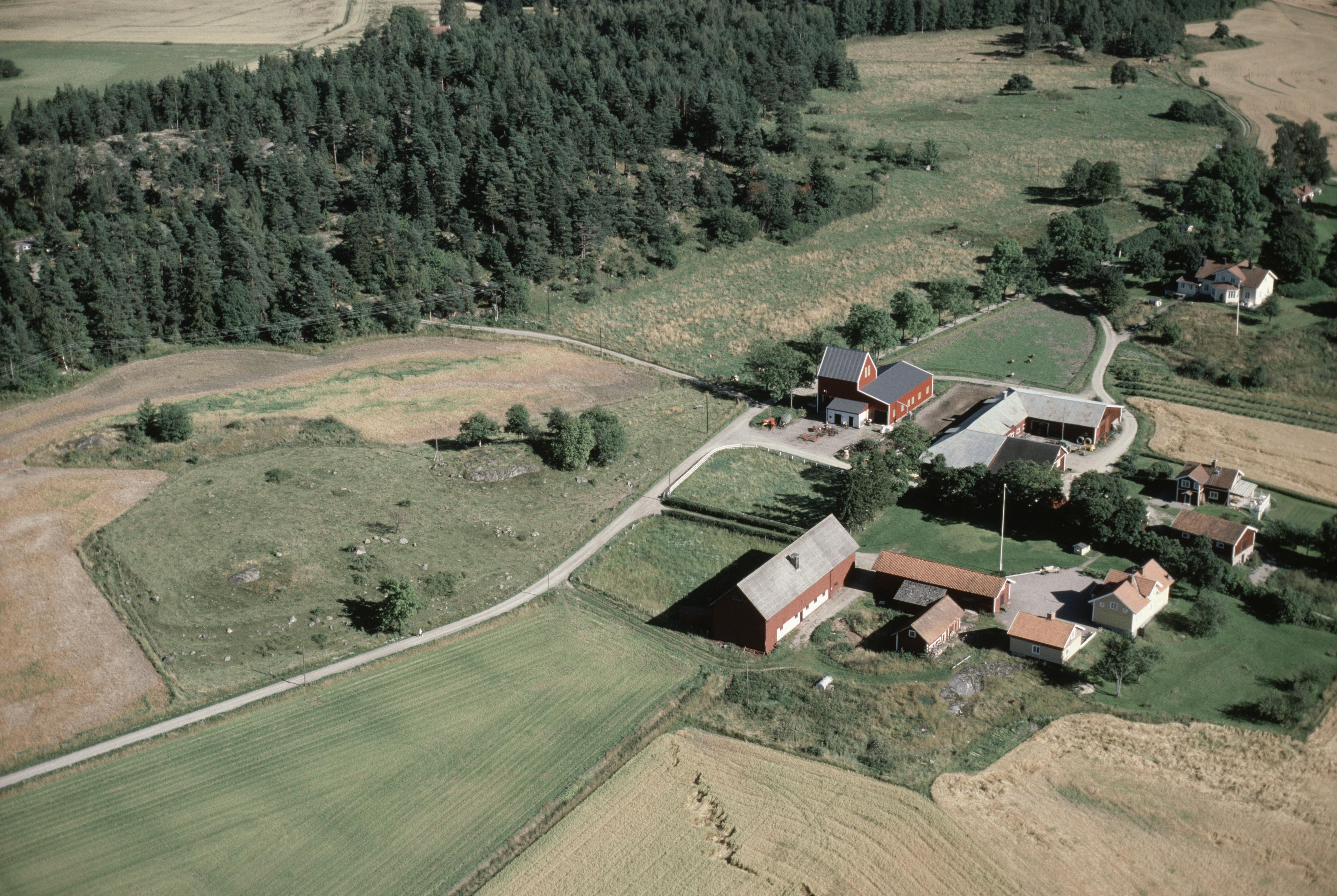 Beskrivning: Stene by. Gårdarna Mellan-Stene och Södra Stene. Till vänster hällristningshällar RAÄnr Vårdinge 92:1, 93:1, 94:1 m.fl. Bilden är tagen mot (väderstreck): OSO