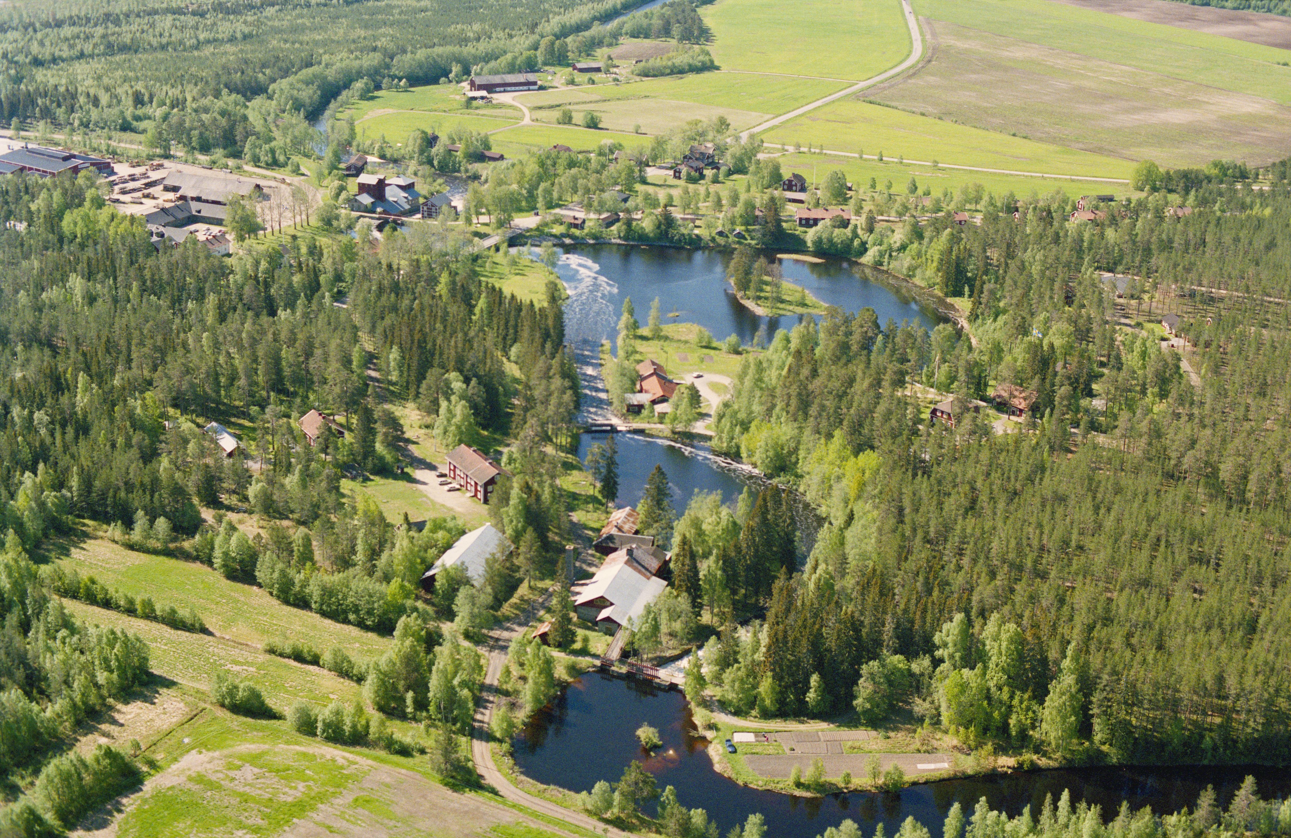 Beskrivning: Olofsfors järnbruk (Olofsfors bruk) vid Leduån. Lustholmen i vattnet över bildens mitt. Bilden är tagen mot (väderstreck): SSV