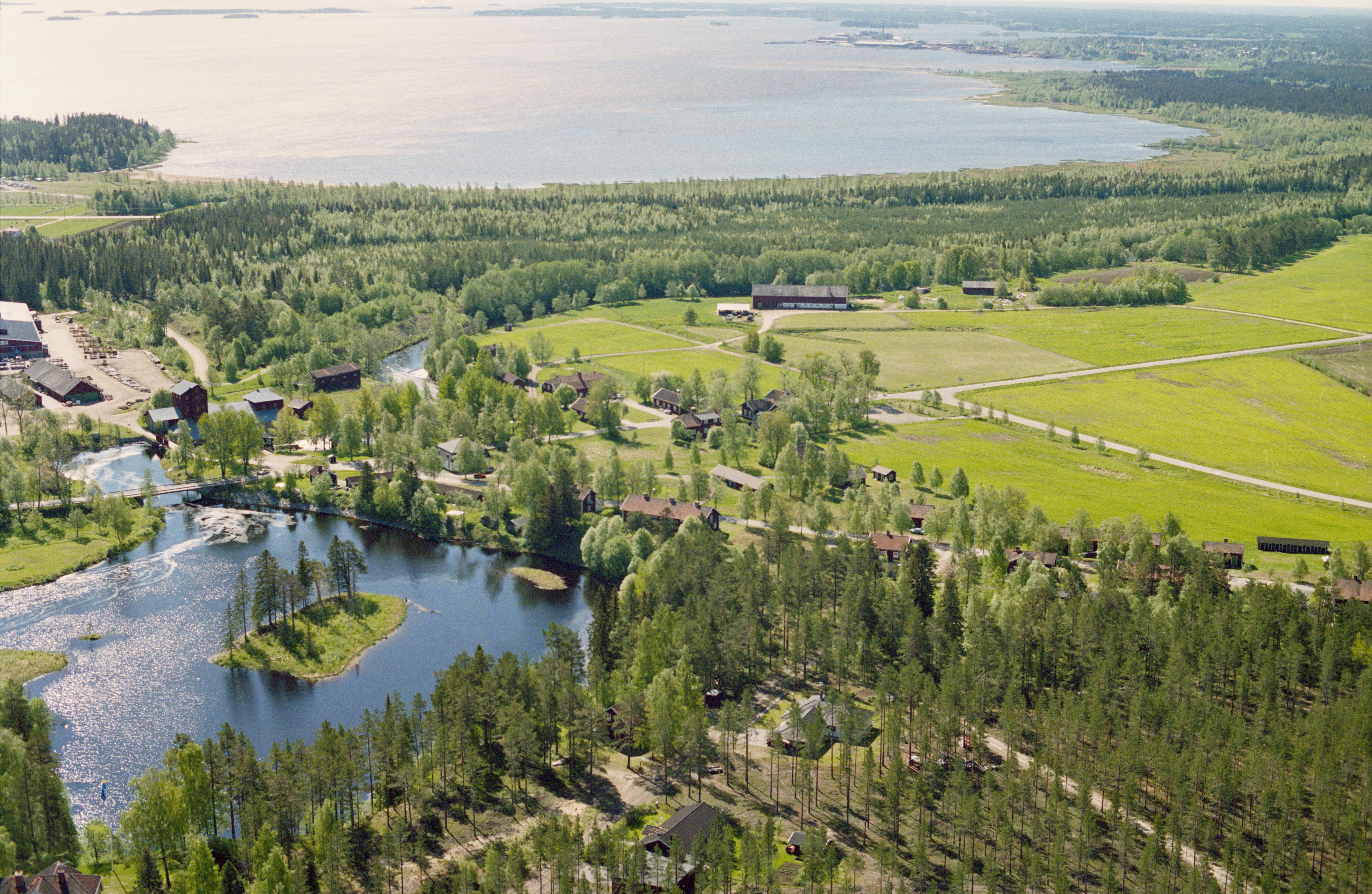 Beskrivning: Olofsfors järnbruk (Olofsfors bruk) vid Leduån. Lustholmen i vattnet nere till vänster. Olofsfors gamla flygfält vid Nordmalingsfjärden uppe till höger. Bilden är tagen mot (väderstreck): SSO