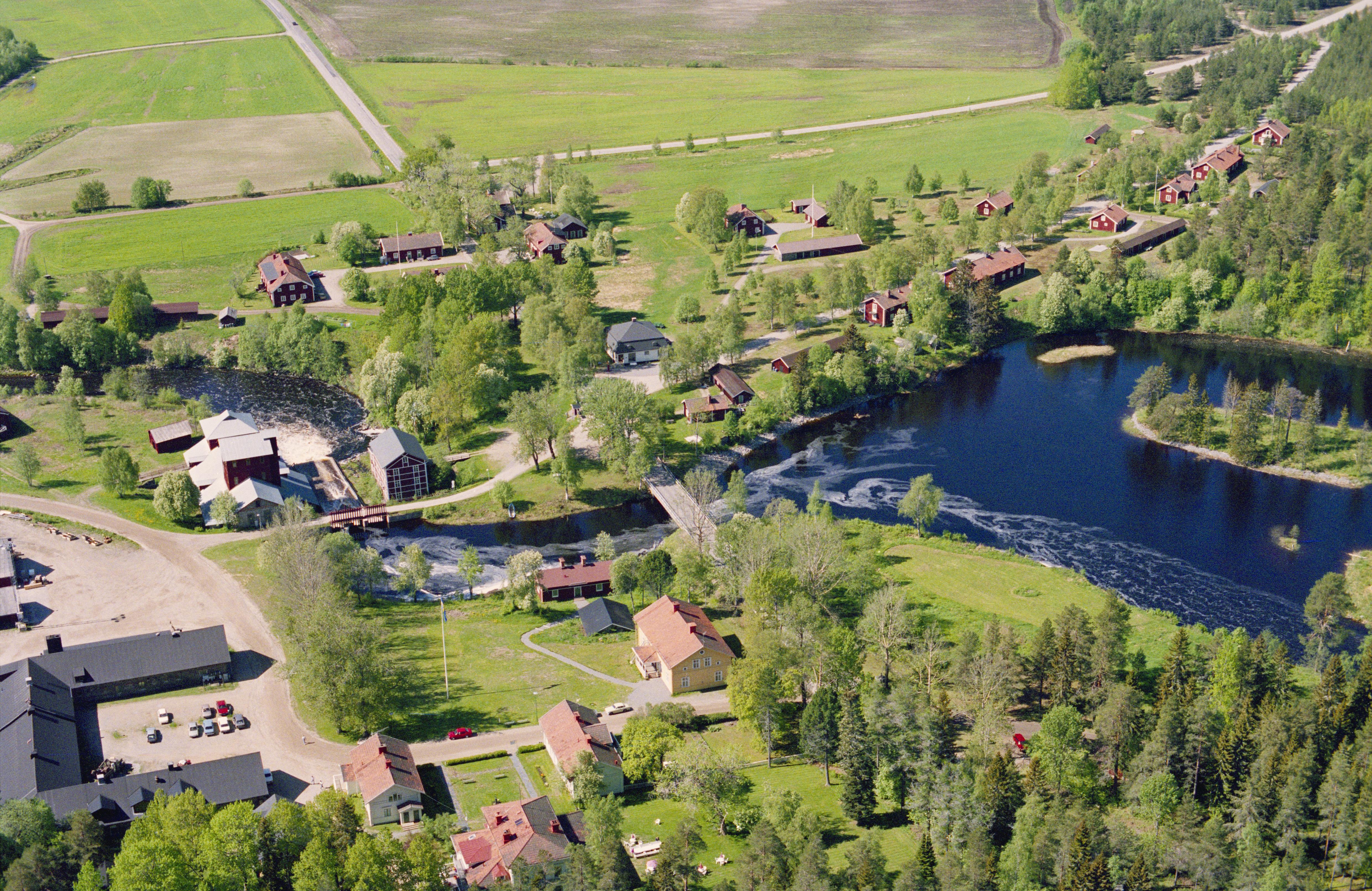 Beskrivning: Olofsfors järnbruk (Olofsfors bruk) vid Leduån. Lustholmen i vattnet till höger om bildens mitt. Bilden är tagen mot (väderstreck): VSV