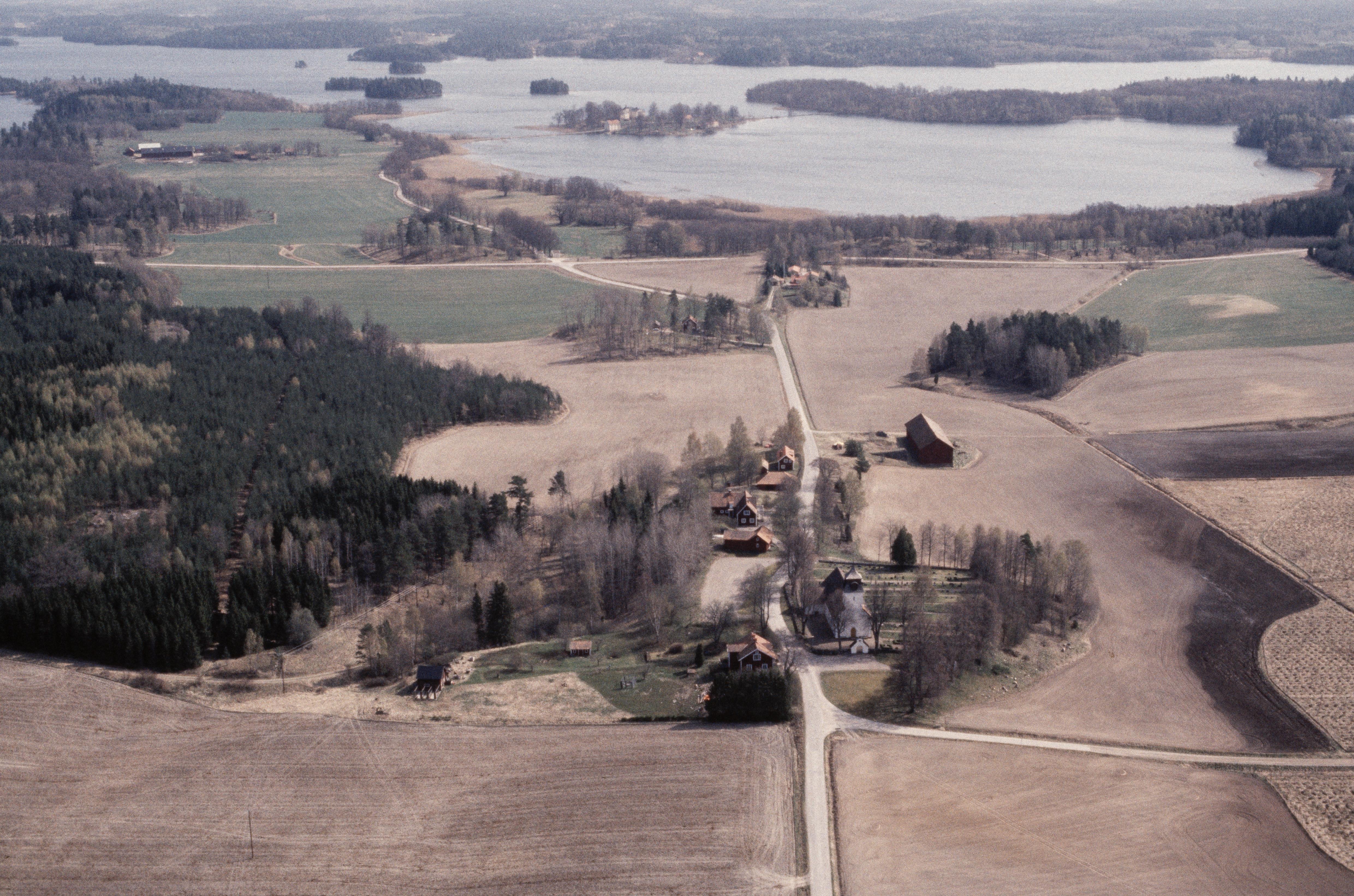 Beskrivning: Årdala kyrka. I bildens övre del Vibyholms slott RAÄnr Årdala 123:1 och till höger Djurön sjön Båven. Bilden är tagen mot (väderstreck): OSO