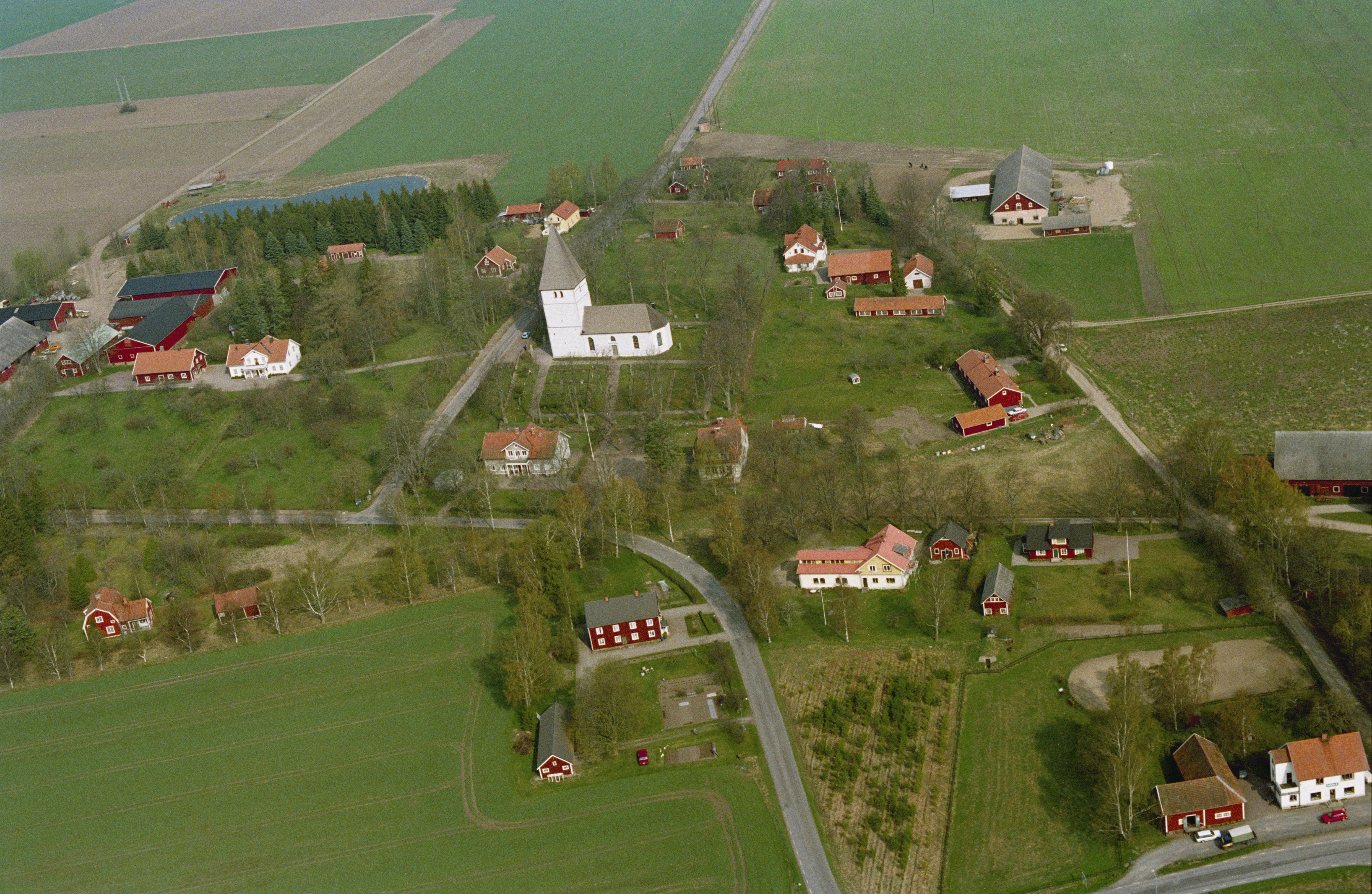 Beskrivning: Bjälbo kyrka och kyrkby. Bilden är tagen mot (väderstreck): NNV