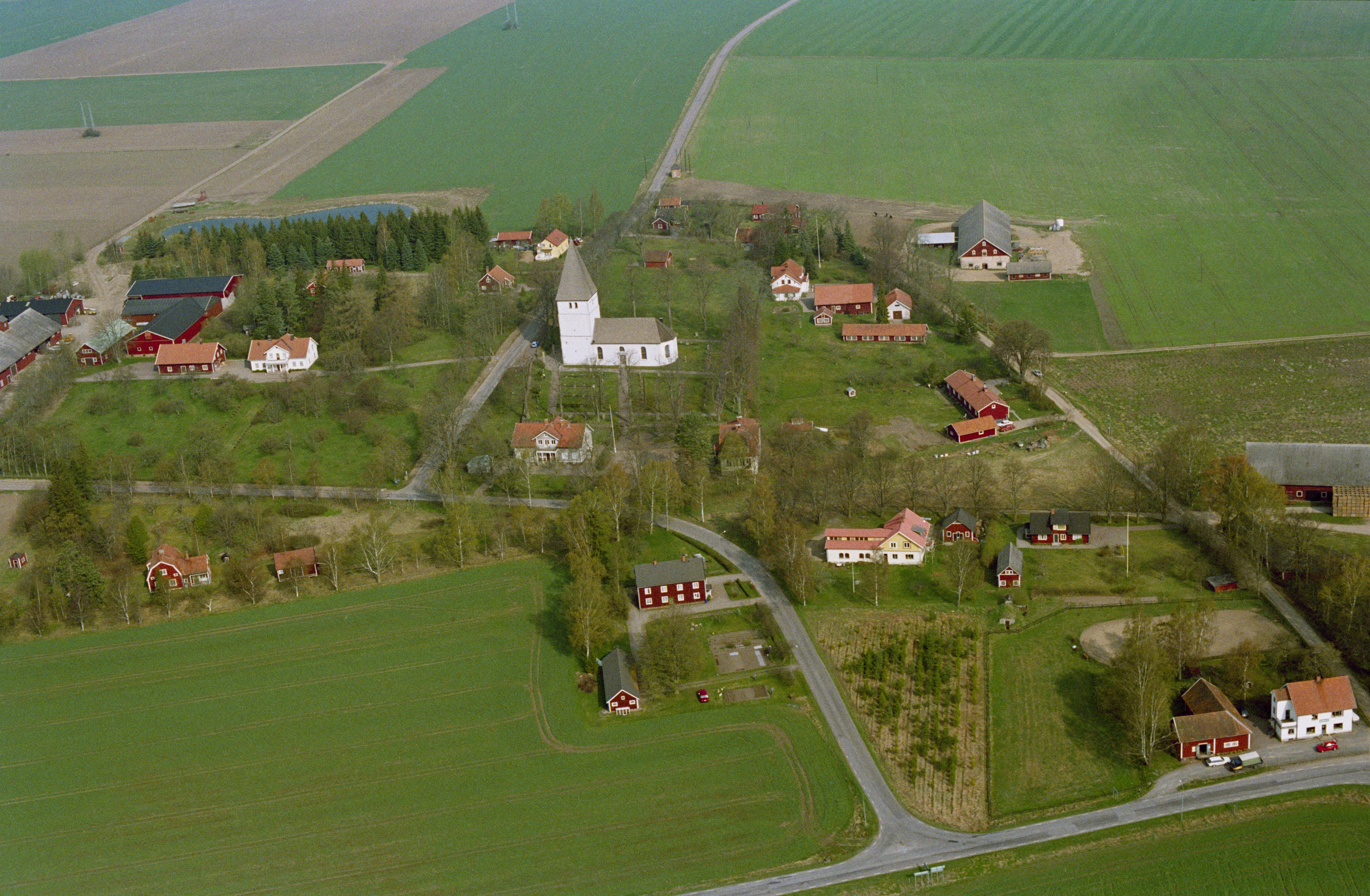 Beskrivning: Bjälbo kyrka och kyrkby. Bilden är tagen mot (väderstreck): NNV