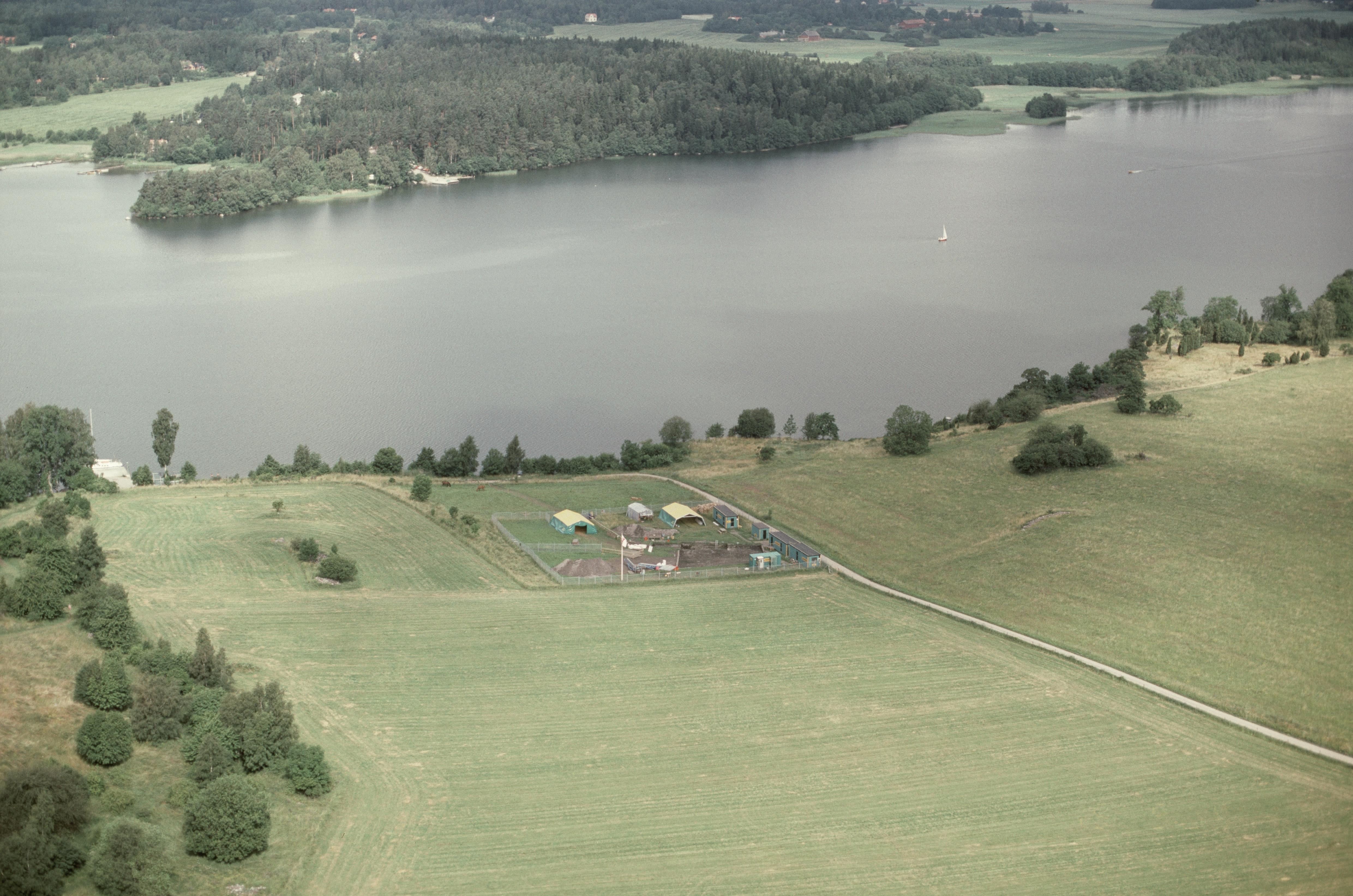 Beskrivning: Fornlämningsområdet Birka på Björkö i Mälaren. Arkeologisk undersökning i norra delen av ön i området Hemlanden och Svarta jorden RAÄnr Adelsö 118:1 vid Stadsvallen Adelsö 119:1-2. Adelsön i bildens övre del. Bilden är tagen mot (väderstreck): NV