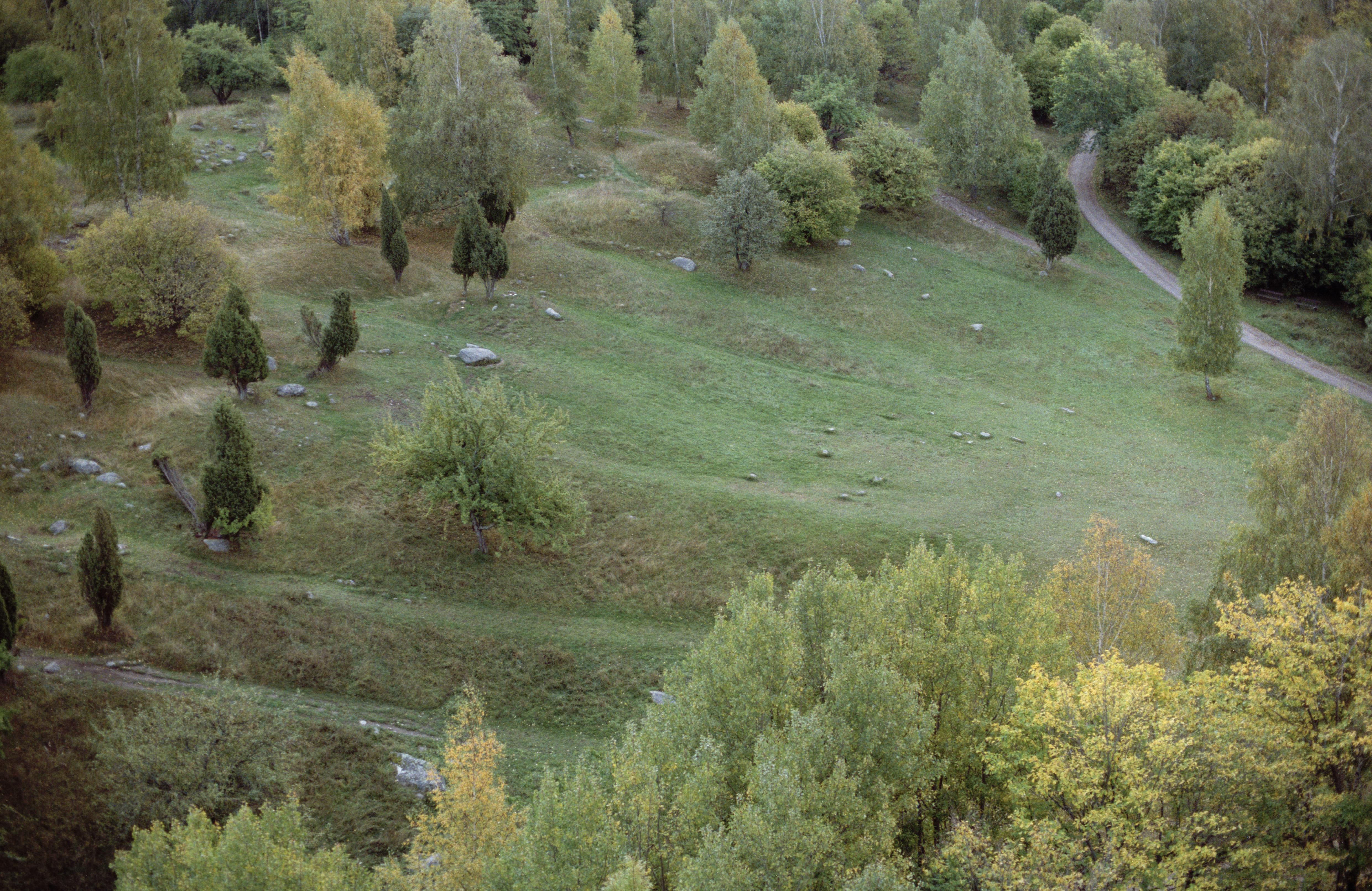 Beskrivning: Fornlämningsområdet Birka på Björkö i Mälaren. Stigar i gravfält Borgs hage RAÄnr Adelsö 35:1 i fornborg Borg RAÄnr Adelsö 34:1. Bilden är tagen mot (väderstreck): Ö