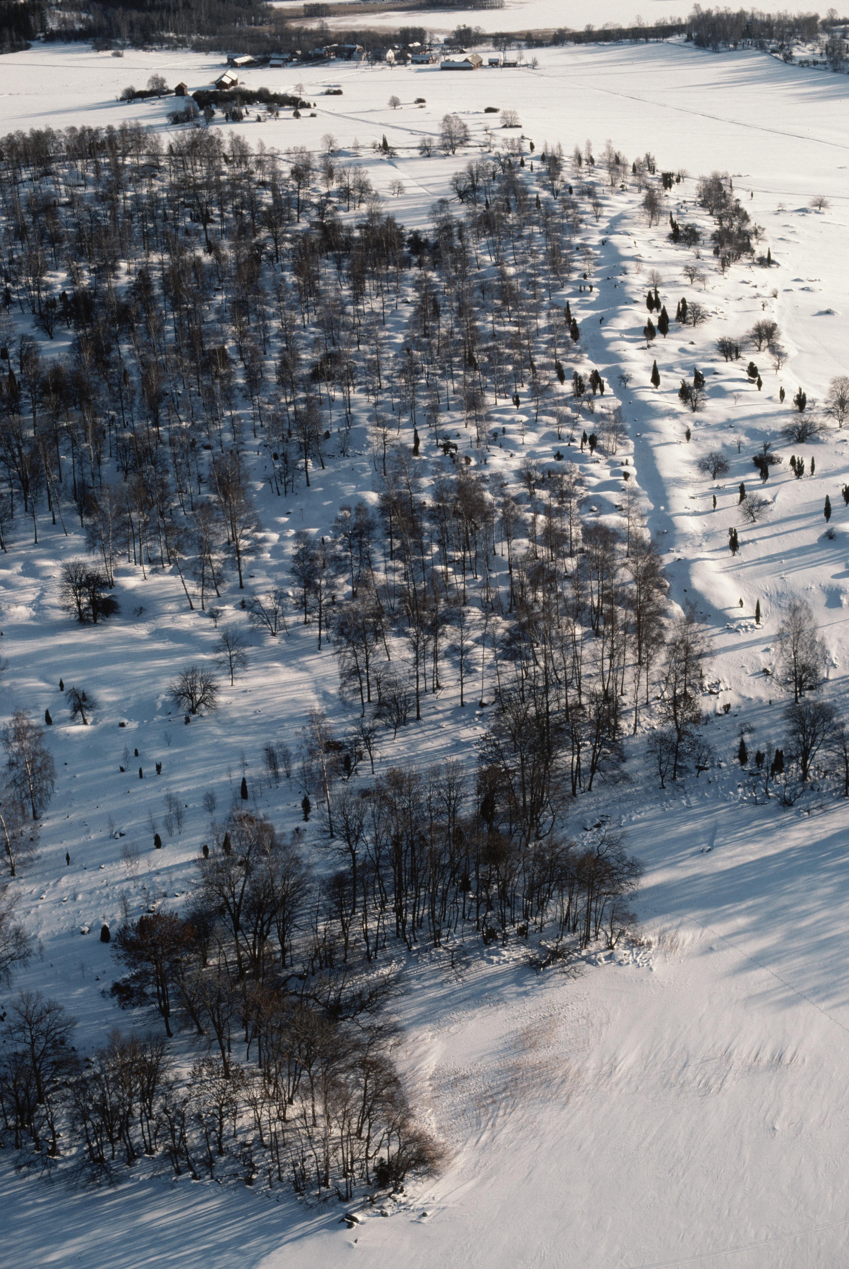 Beskrivning: Fornlämningsområdet Birka på Björkö i Mälaren. Norra delen av ön i området Hemlanden och Svarta jorden RAÄnr Adelsö 118:1 vid Stadsvallen Adelsö 119:1-2. Grindsbacka och Björkö by i bildens övre del. Bilden är tagen mot (väderstreck): SSO