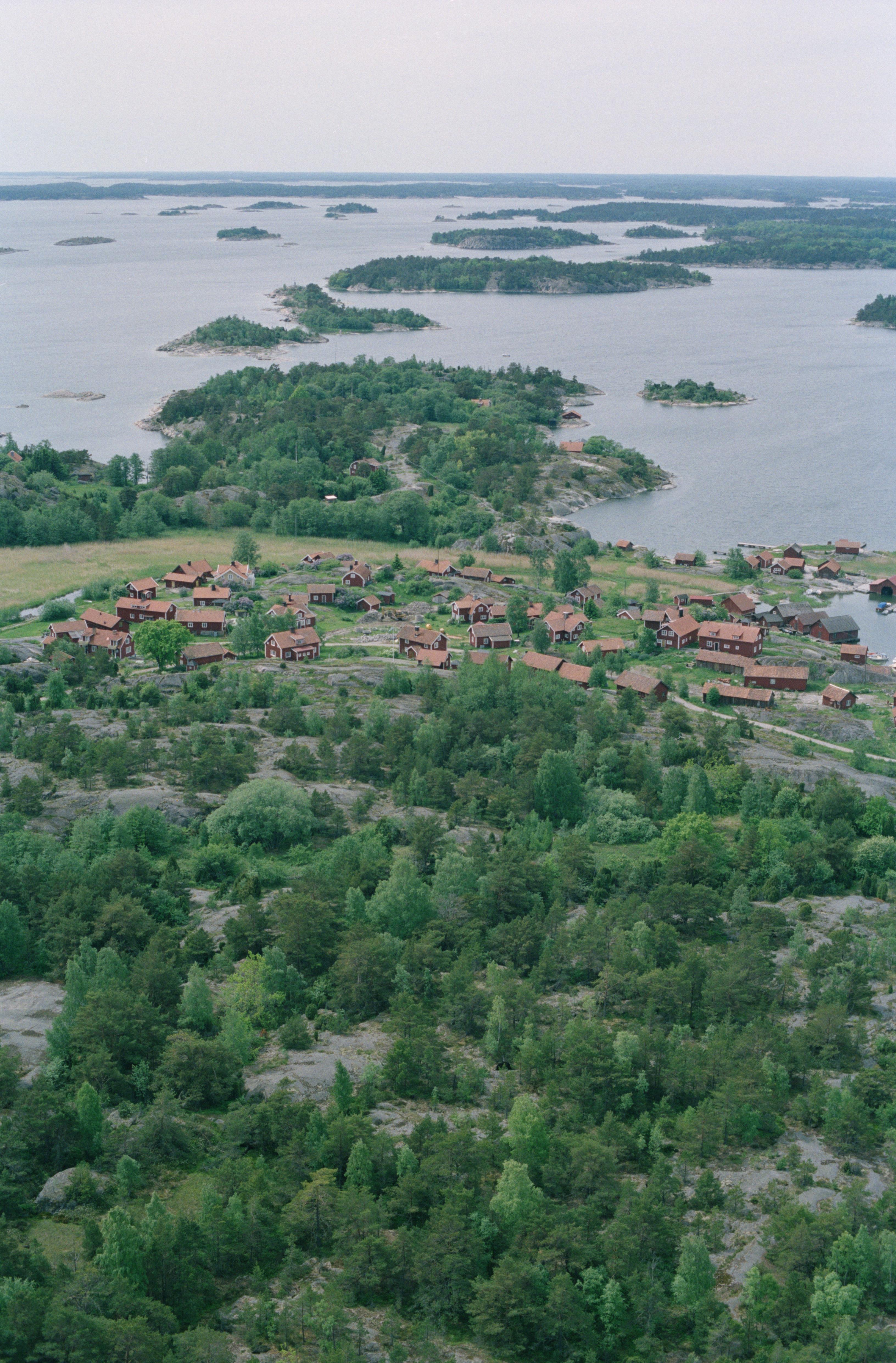 Beskrivning: Gryts skärgård. Ön Harstena, sydvästra delen. Harstena fiskeläge och lotshamn. Ett träd (ek) RAÄnr Gryt 101:1 i byn. Bilden är tagen mot (väderstreck): SSV