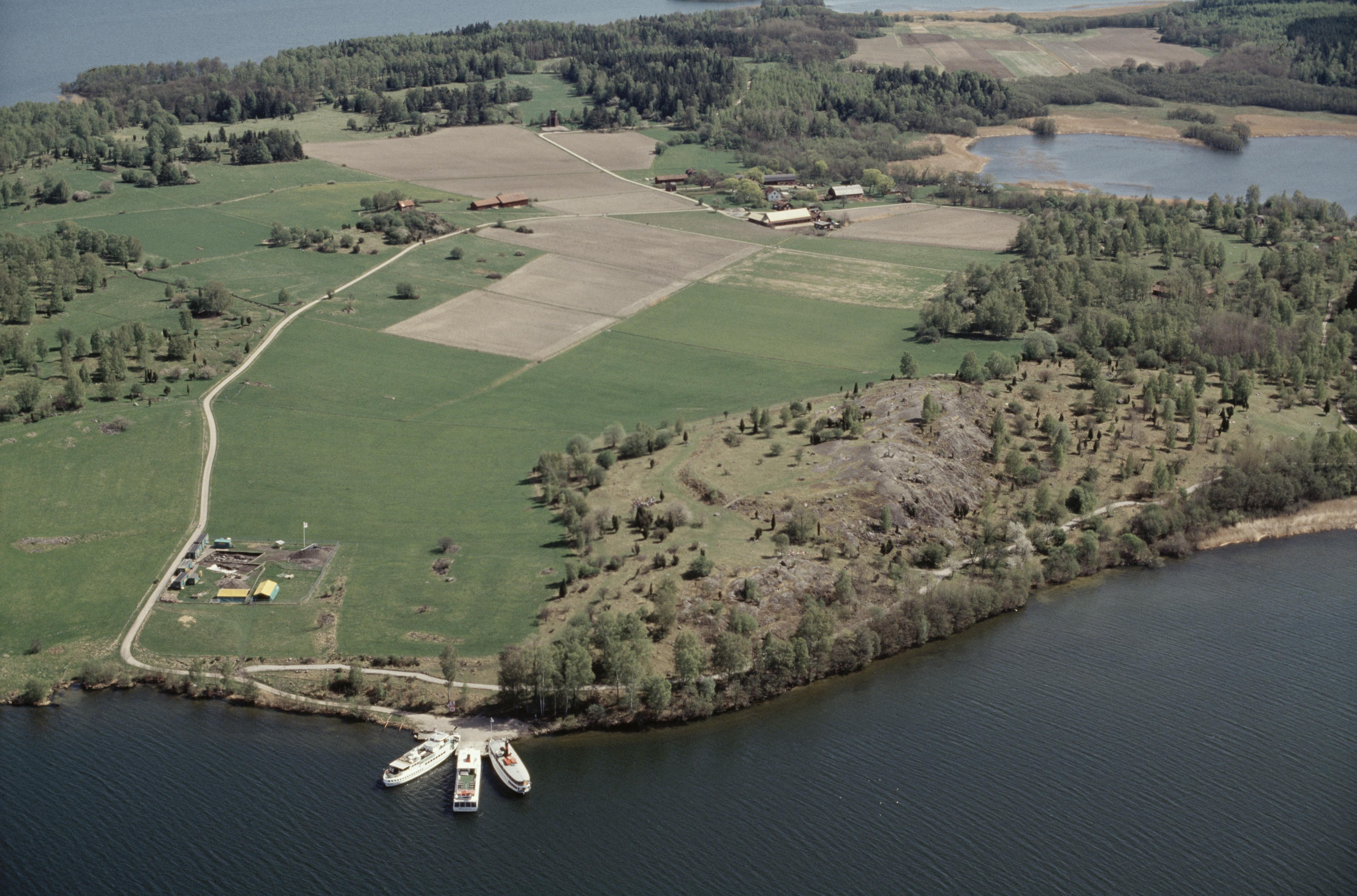 Beskrivning: Fornlämningsområdet Birka på Björkö i Mälaren. Arkeologisk undersökning i norra delen av ön i bo- och gravplats Hemlanden och Svarta jorden RAÄnr Adelsö 118:1 vid Stadsvallen Adelsö 119:1-2 och fornborg Borg Adelsö 34:1. Grindsbacka och Björkö by vid bildens mitt. Bilden är tagen mot (väderstreck): OSO