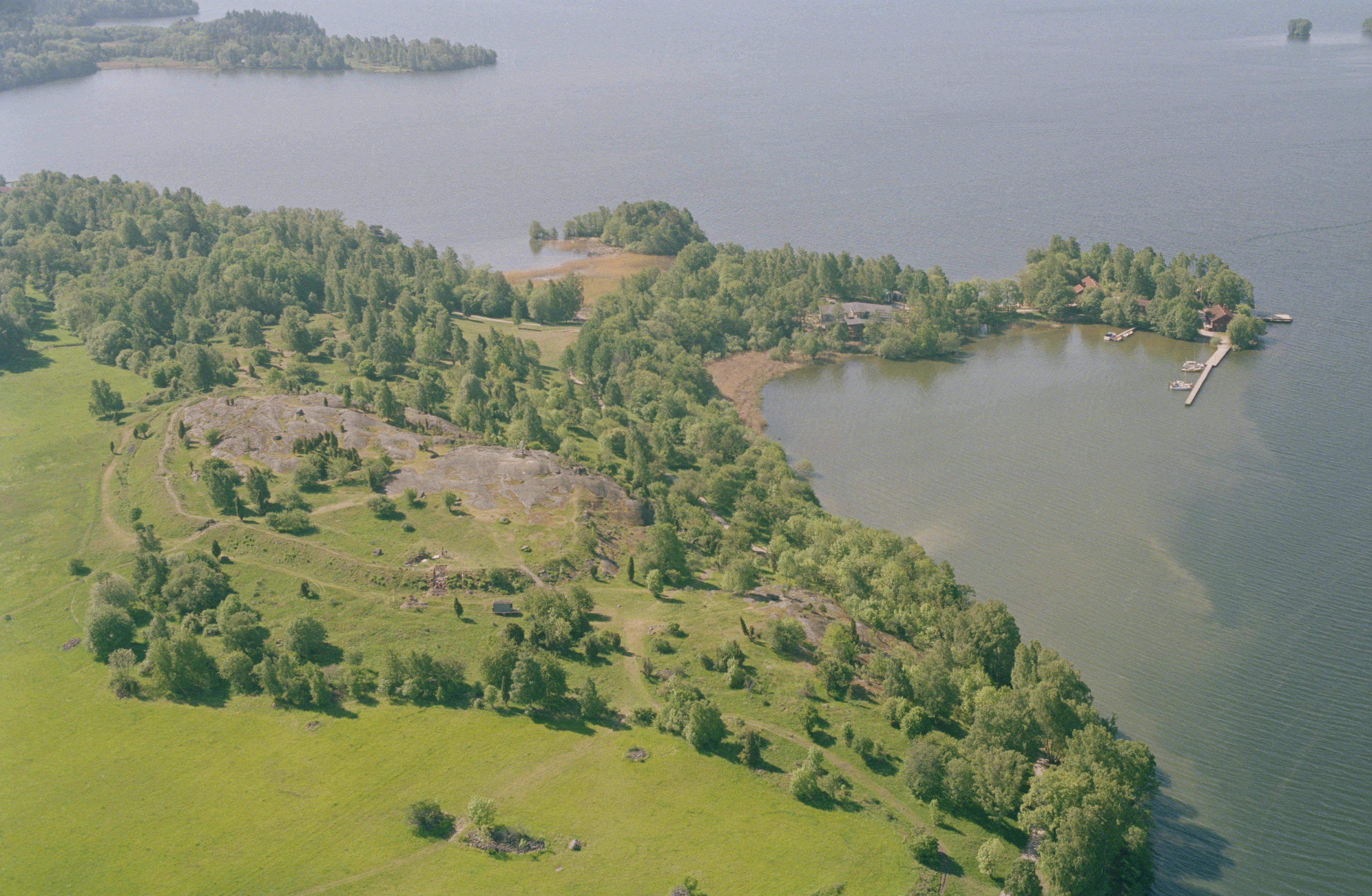Beskrivning: Fornlämningsområdet Birka på Björkö i Mälaren. Vid bildens mitt arkeologisk undersökning i vallen till fornborg Borg RAÄnr Adelsö 34:1 vid Ansgarsmonumentet. I bildens övre del gravfält Borgs hage RAÄnr Adelsö 35:1 och Birka Museum på Ångholmen. I bildens nedre del bo- och gravplats Svarta jorden RAÄnr Adelsö 118:1. Bilden är tagen mot (väderstreck): S