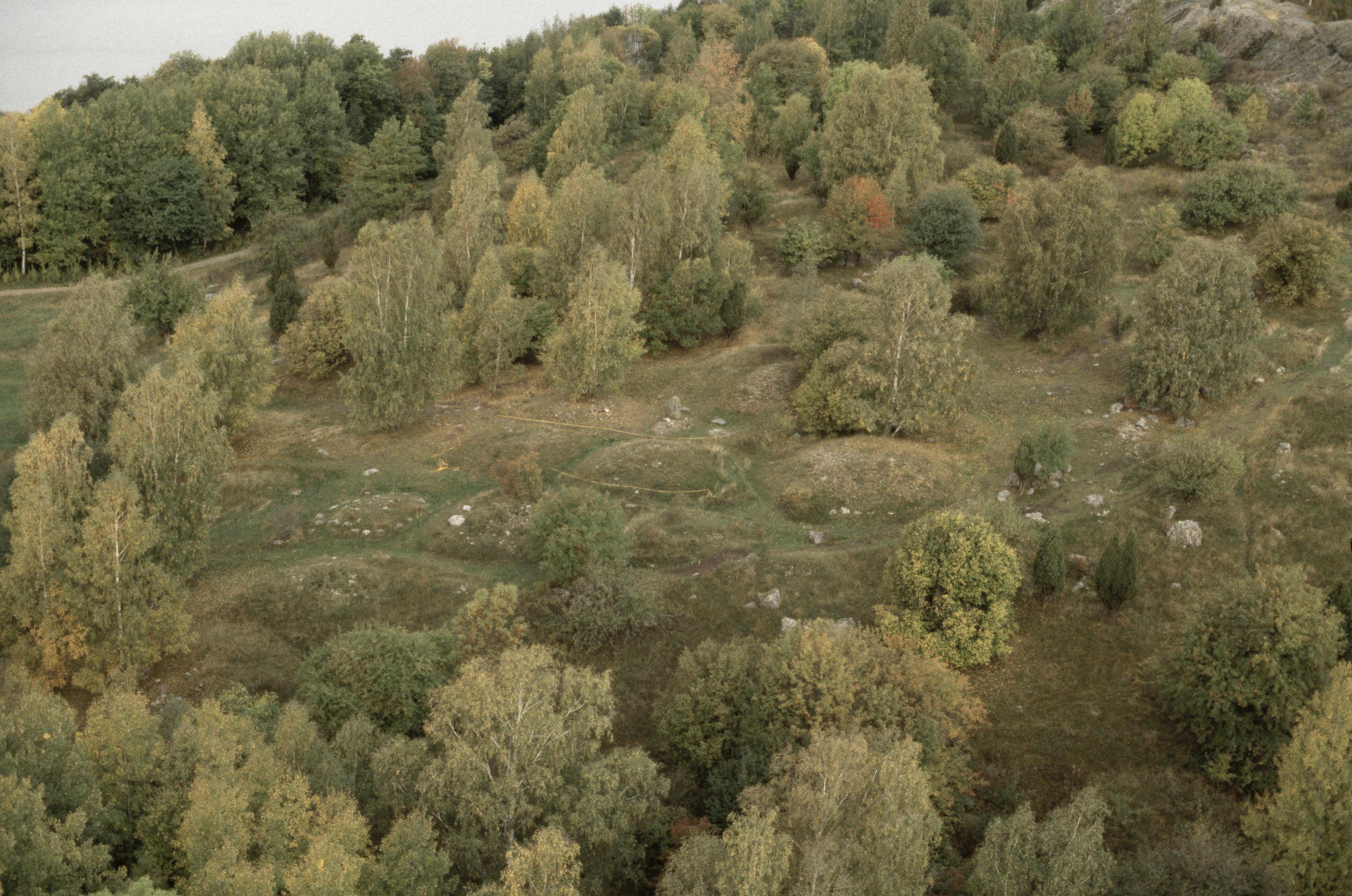 Beskrivning: Fornlämningsområdet Birka på Björkö i Mälaren. Stigar i gravfält Borgs hage RAÄnr Adelsö 35:1 vid fornborg Borg RAÄnr Adelsö 34:1. Bilden är tagen mot (väderstreck): VNV