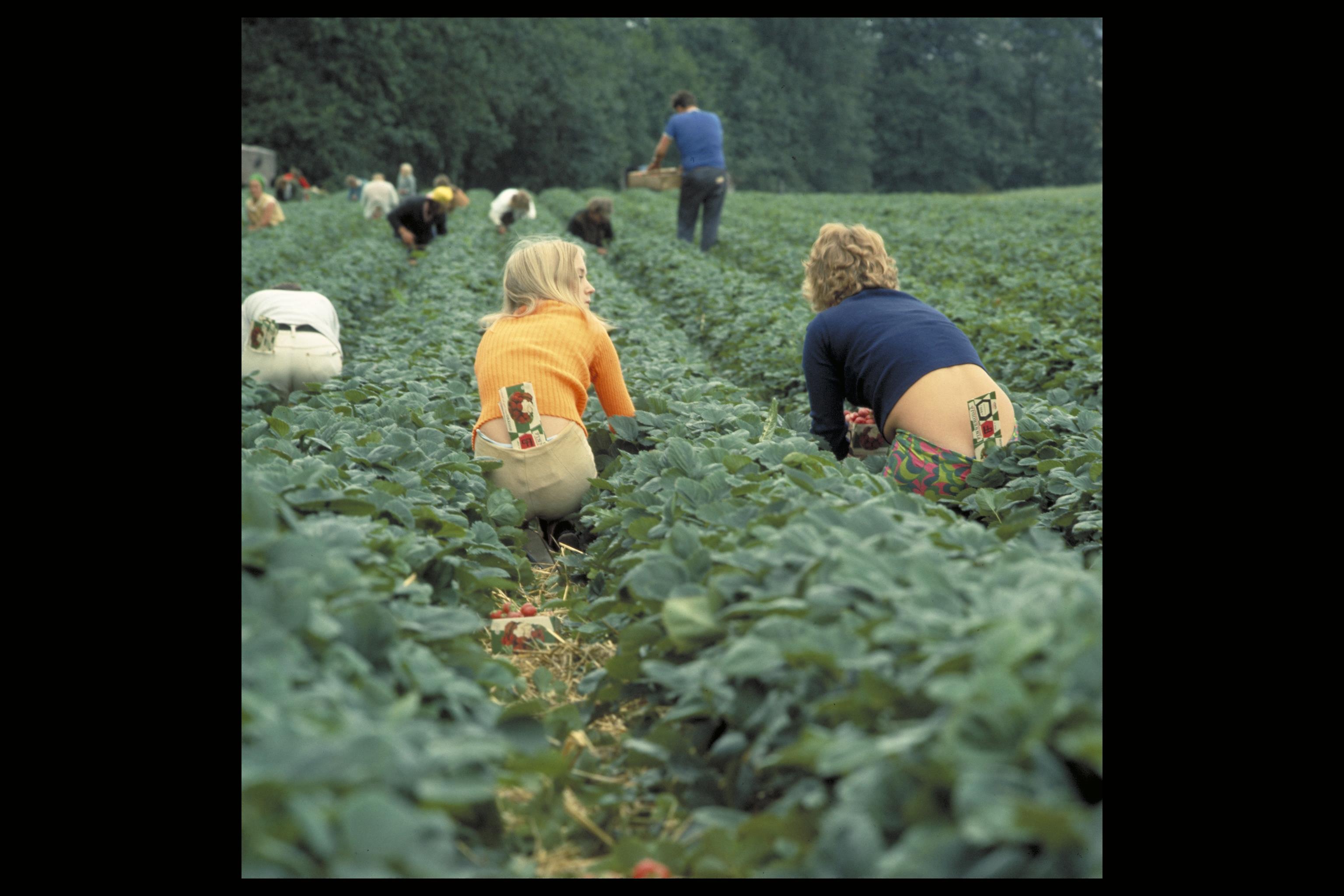 Jordgubbsplockning. Bilden troligen från slutet av 1960-talet.